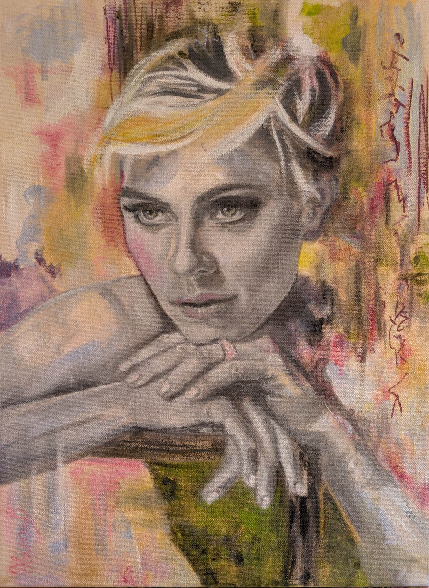 This painting is following the process that I am starting to prefer for my paintings; I start with an abstract background in acrylic and markers and painting the figure in after. Using oil in the final layers for refinement and dept. This portrait is fan art based on Scarlett Johansson.