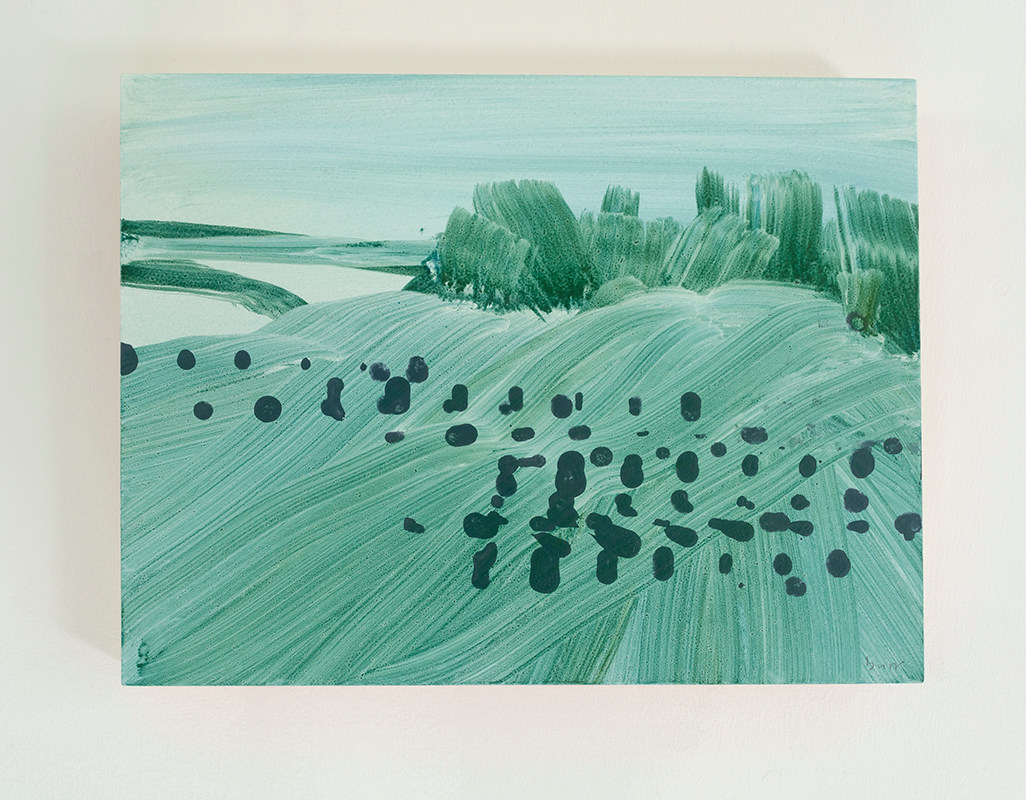 A dynamic emerald wash painting with a high point on the right, lakelike views to the left, and grey purple repeating marks in the foreground.