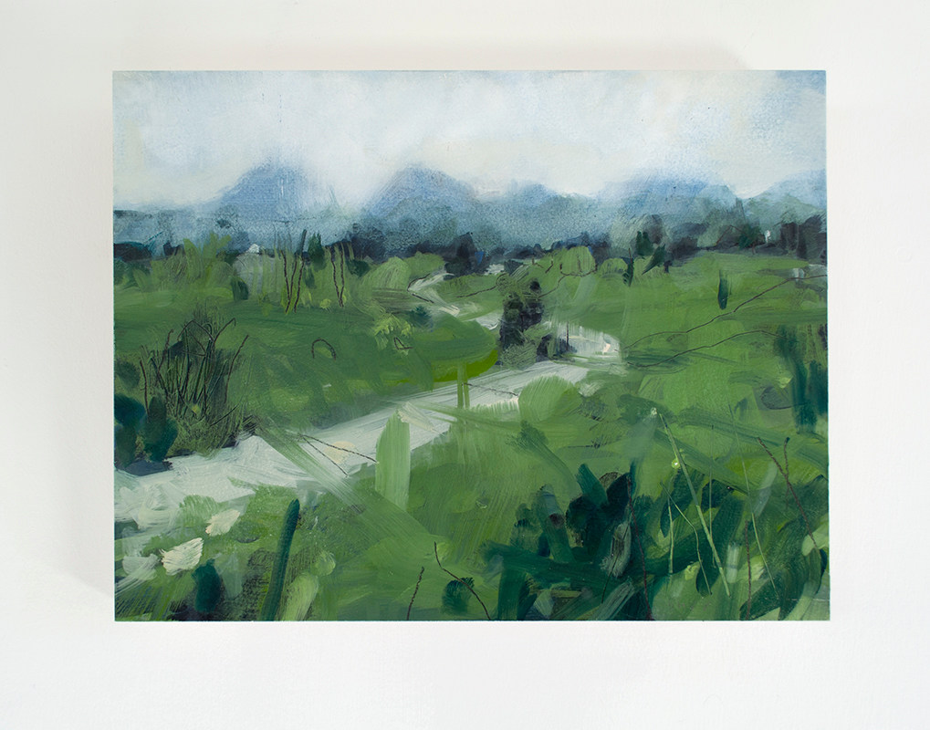 A deep green view with blurred blue mountains, a whitish blue sky and a tawny grey beige snaking road or path through the center of a clearing.