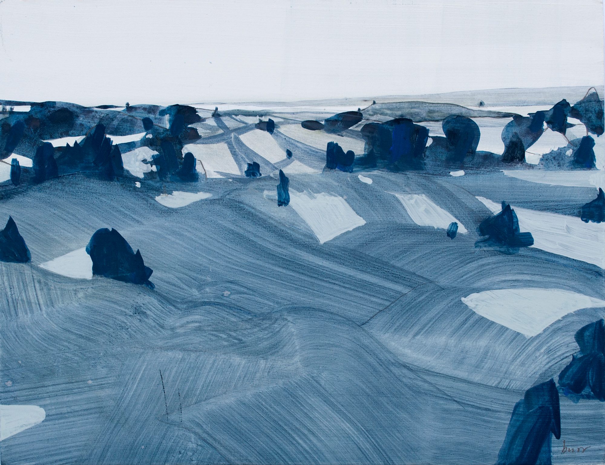 An abstract landscape painting in varying degrees of deep blue. A whitish sky in the top third, dark tree clusters and patches, a little quilt like, nice clean marks, of rolling fields.