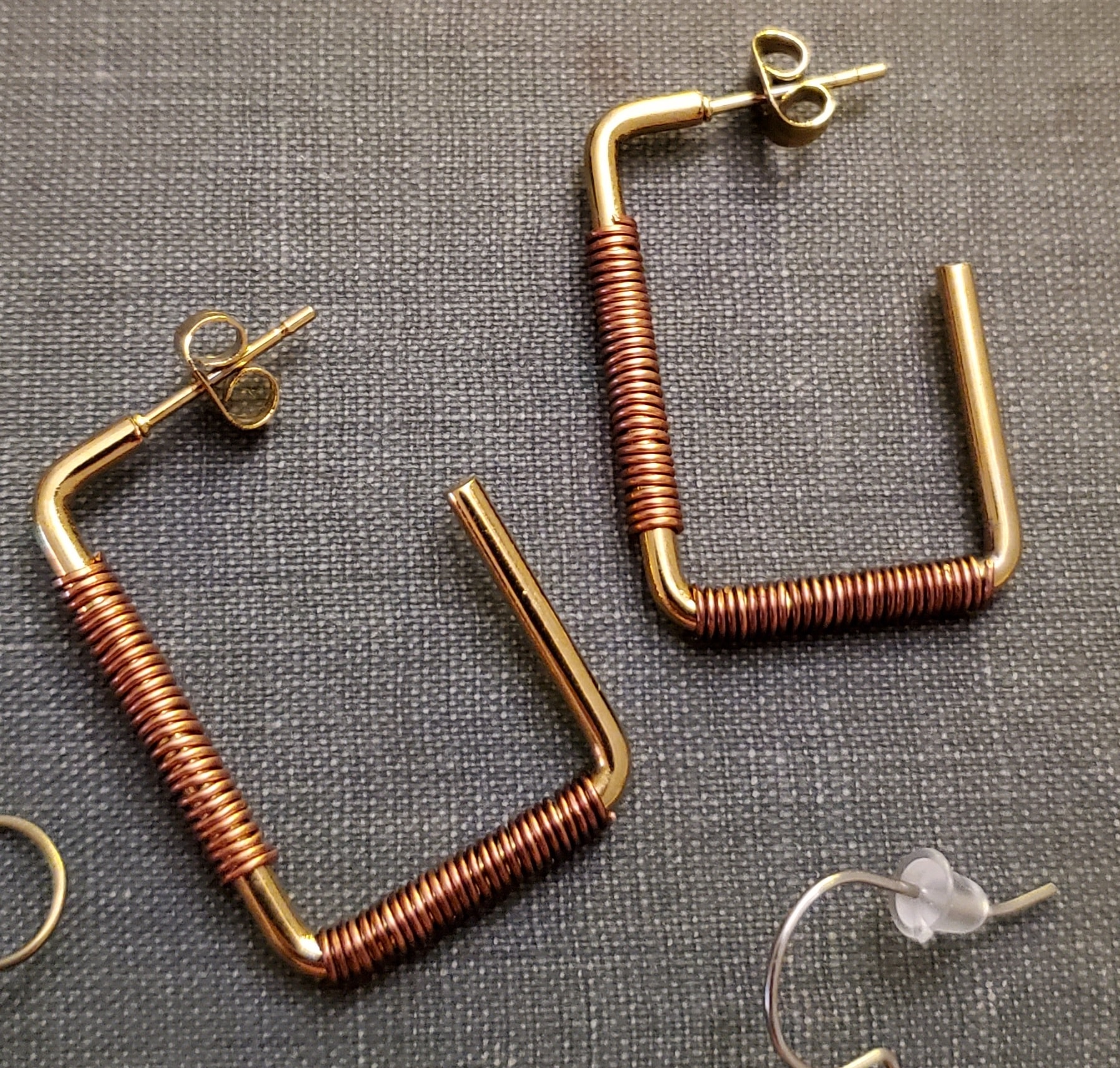 Beautiful magnesite with faux white feathers. Golden brass wrapped in copper. Hypoallergenic. Only one of its kind.