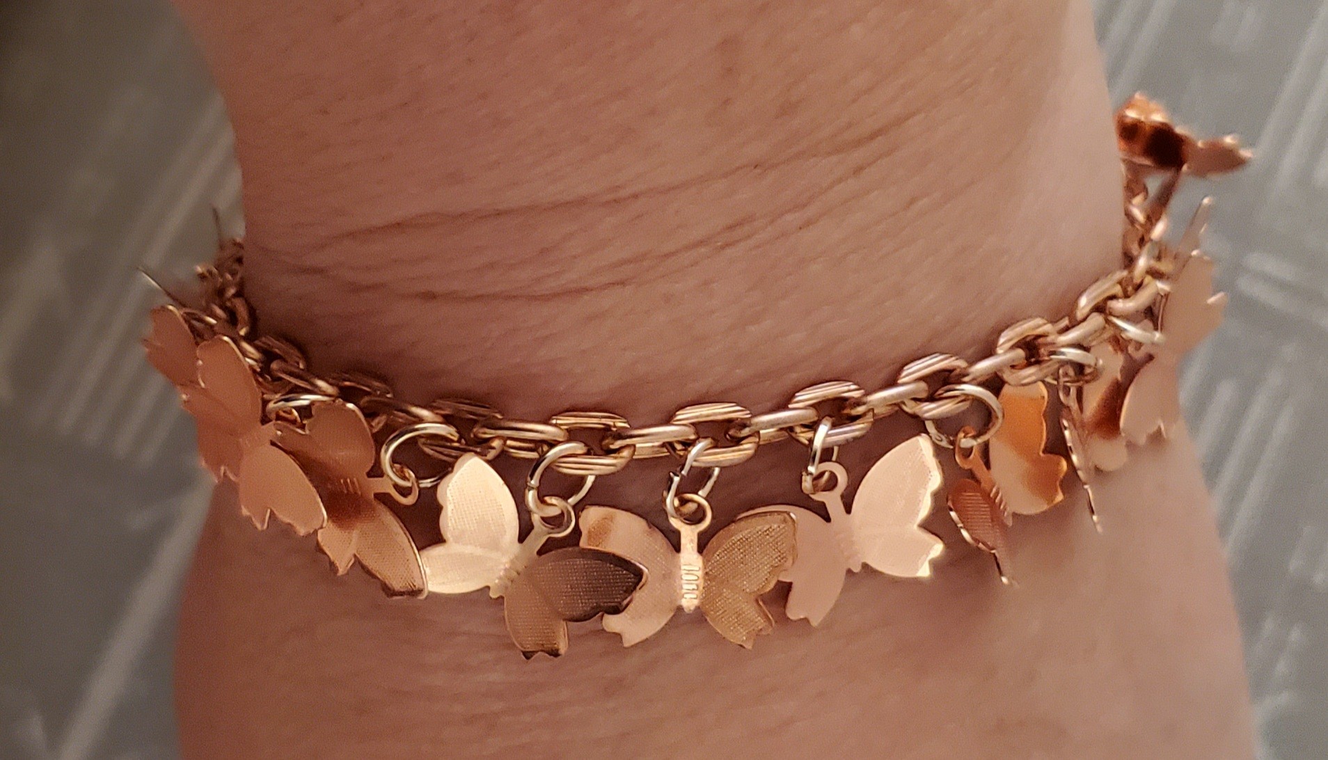 Copper butterfly charms adorn a rose gold chain bracelet. Fun and stunning. Hypoallergenic. Only one of its kind.