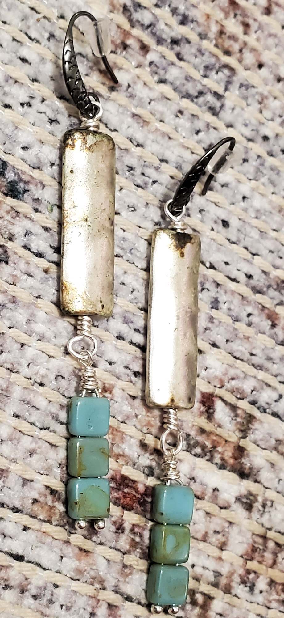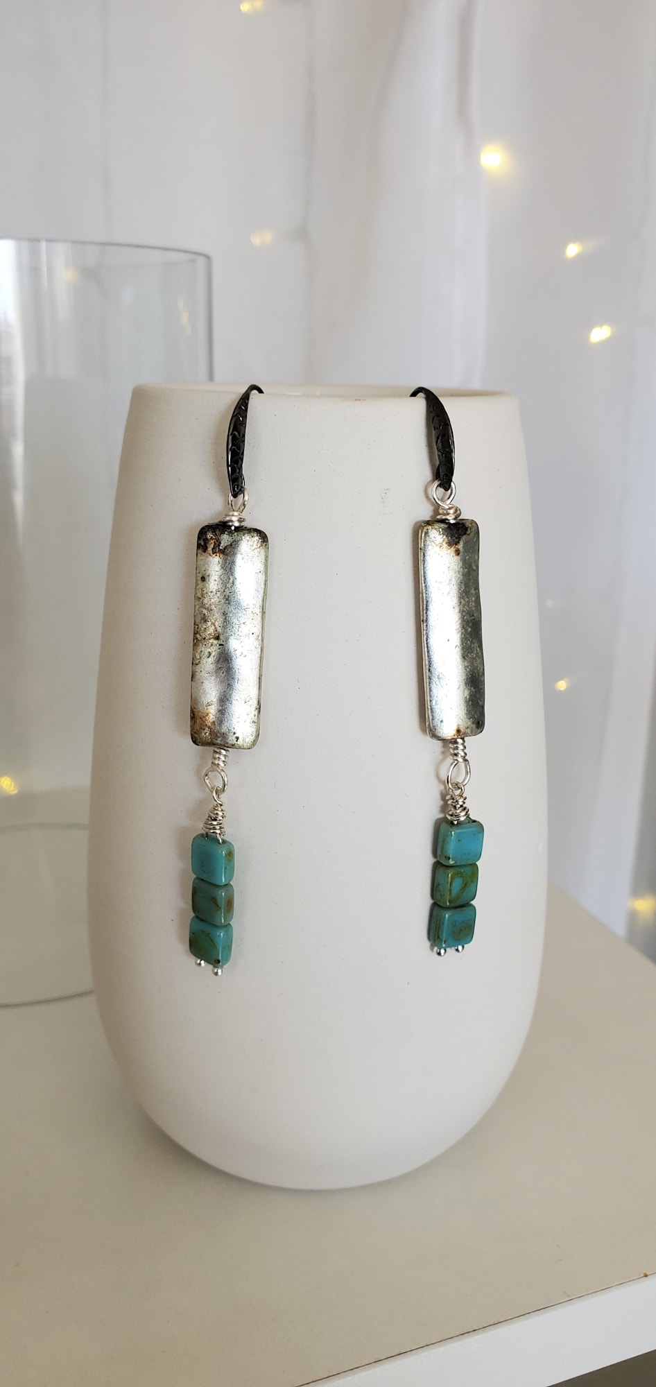 Silver and Turquoise linear earrings elegantly designed and inspired by Cherokee design. Handcrafted. One of a kind. Hypoallergenic.