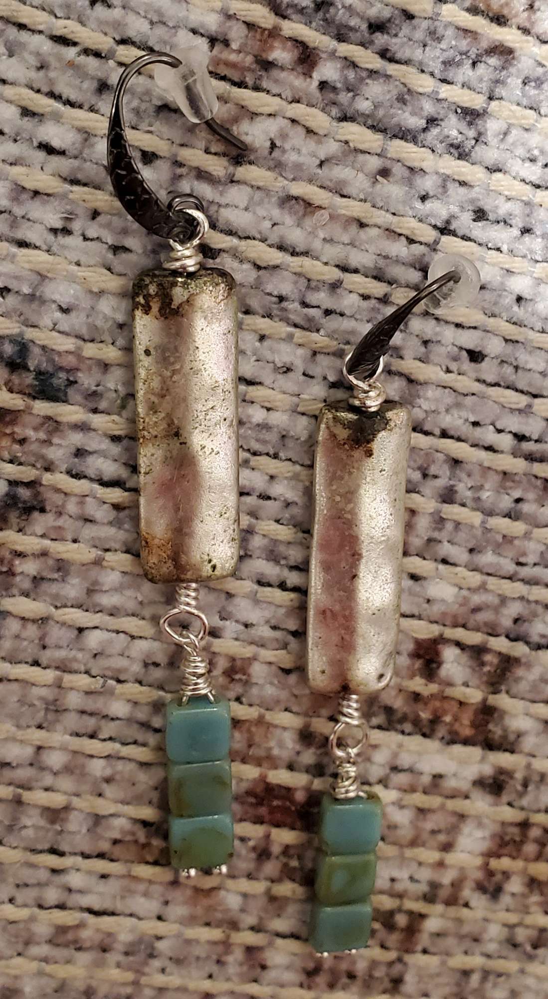 Silver and Turquoise linear earrings elegantly designed and inspired by Cherokee design. Handcrafted. One of a kind. Hypoallergenic.