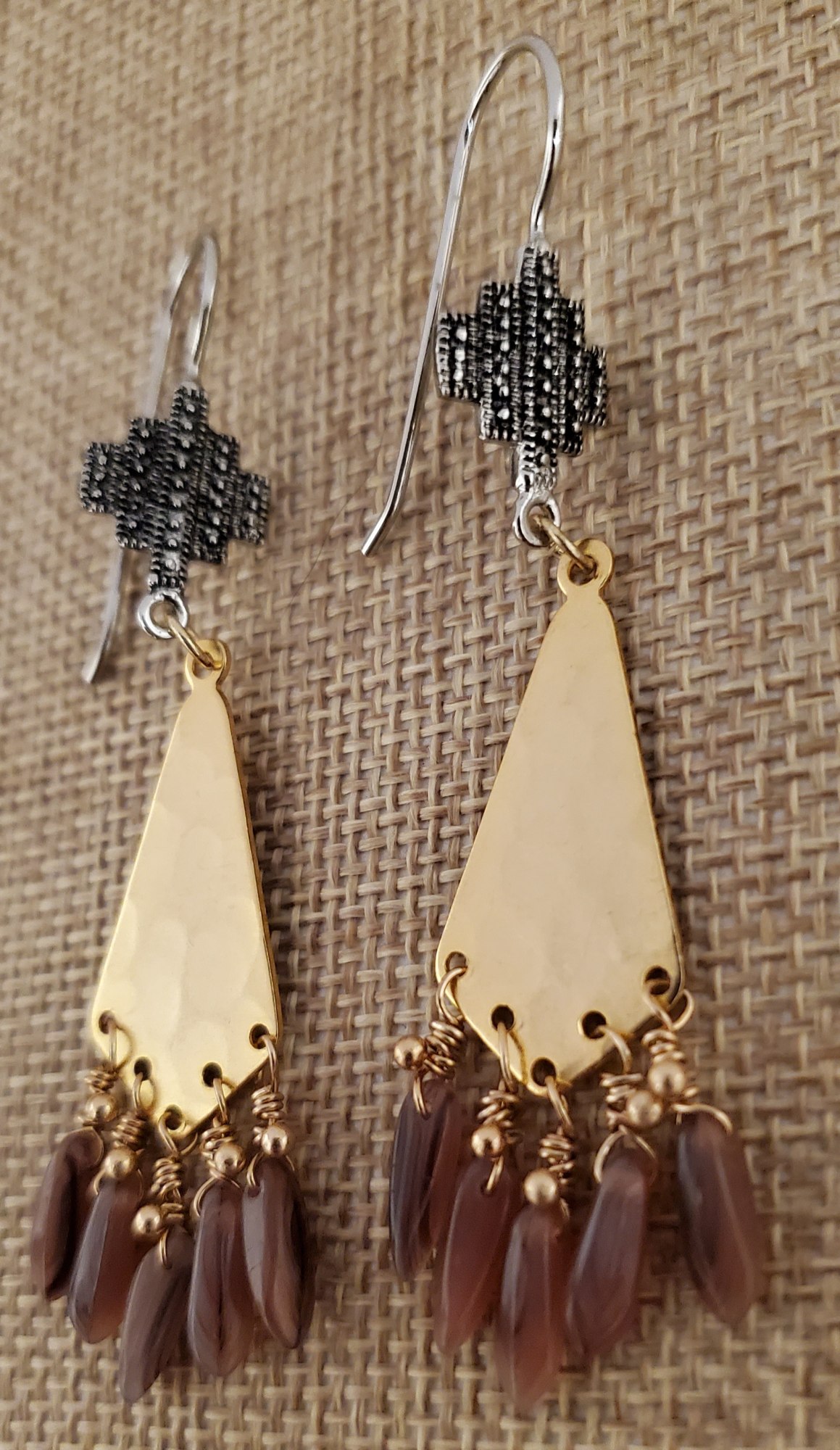 10k Gold charms with southwest design silver hooks and taupe and purple beads. Made for a princess. Hypoallergenic. Only one of its kind.