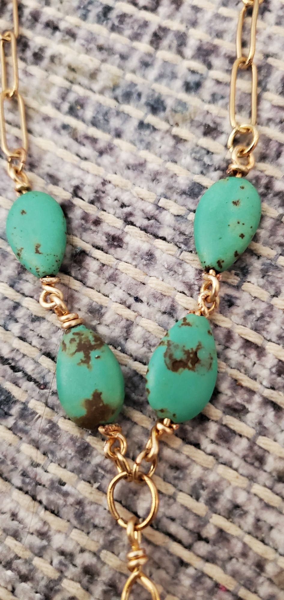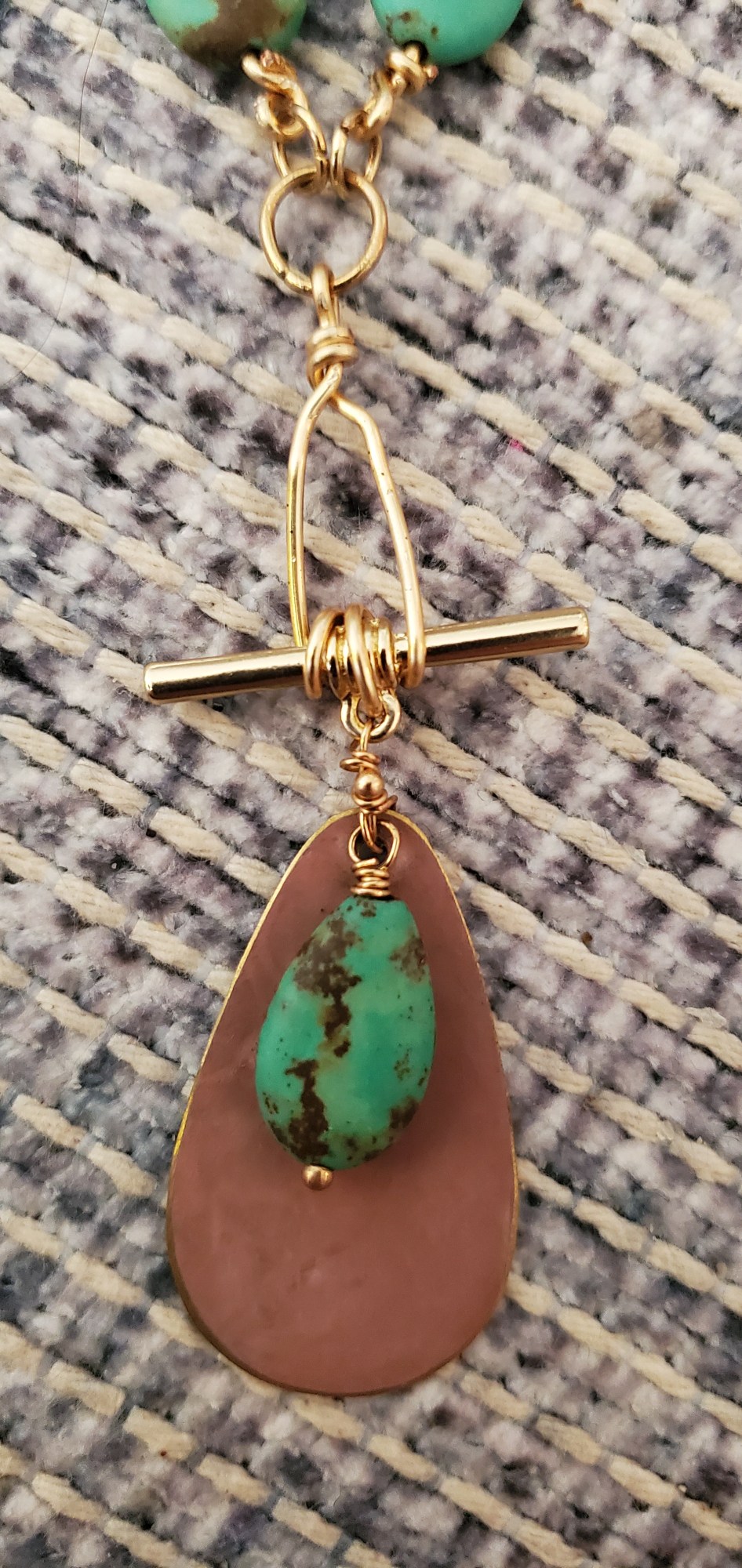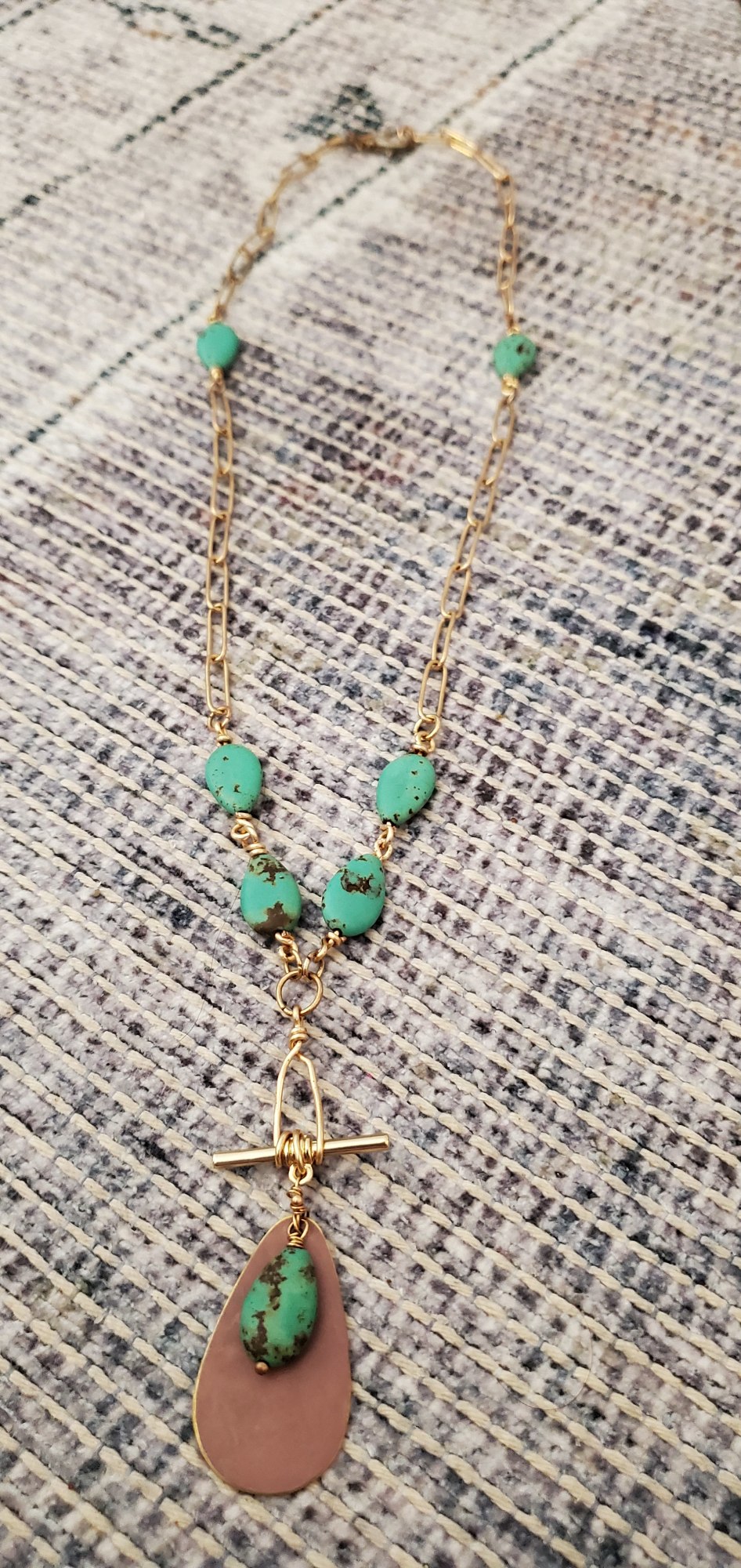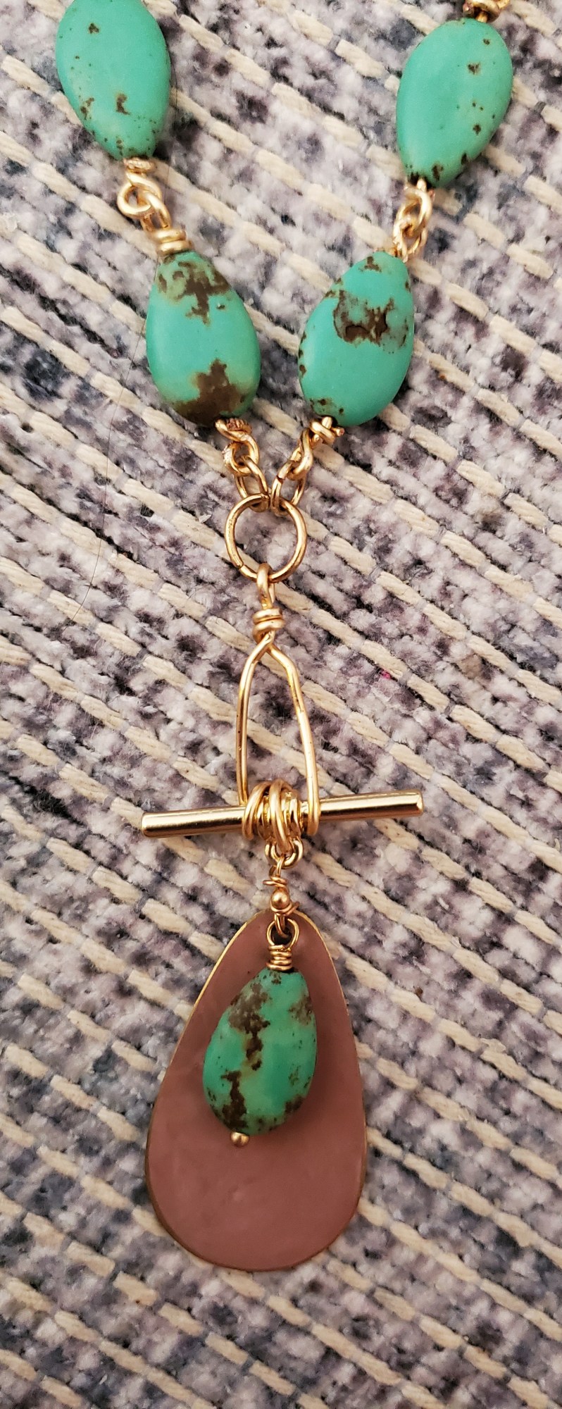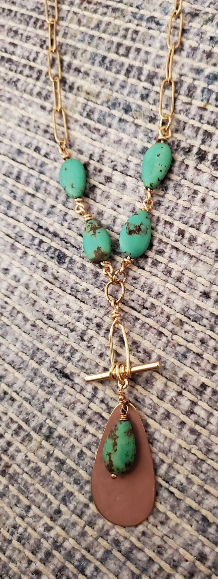 Patina copper mixed with magnesite stone and gold chain create an elegant statement piece. Hypoallergenic and only one of its kind.