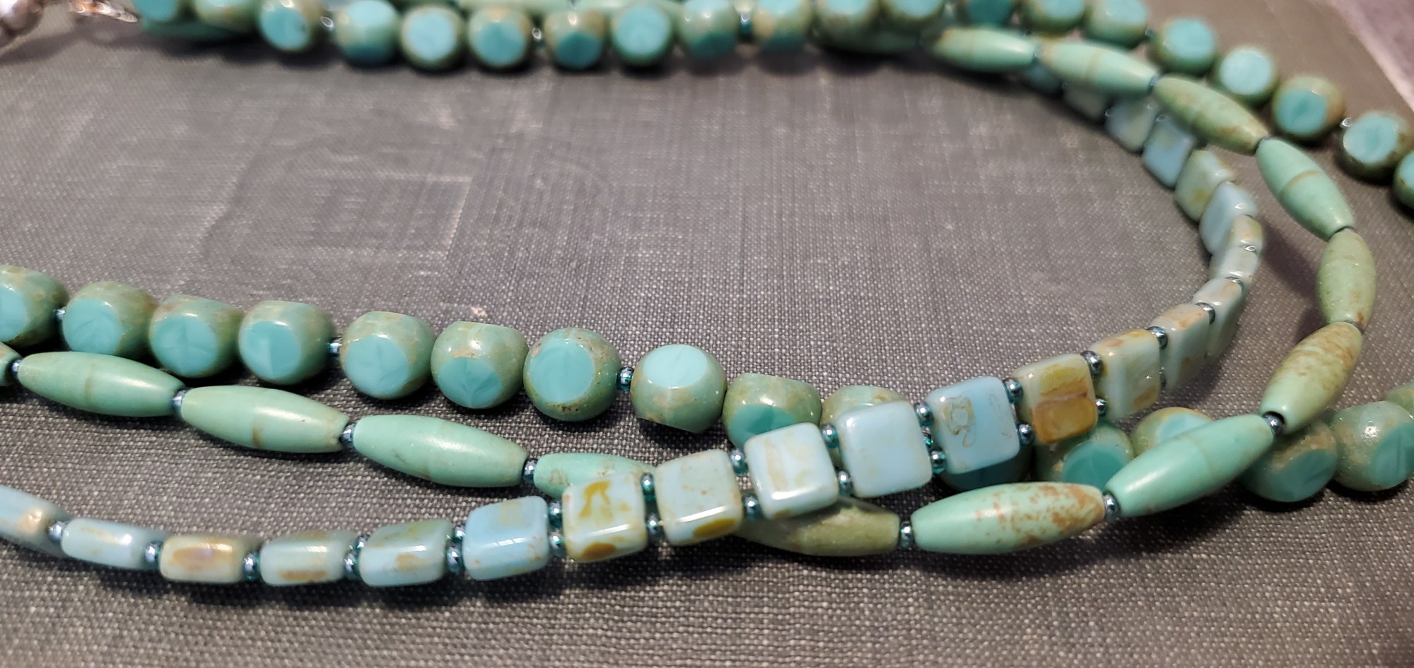 Genuine Magnesite and turquoise colored glass blended with pure silver elements to create a special one of a kind piece. Inspired by native designs. Hypoallergenic. Only one of its kind.