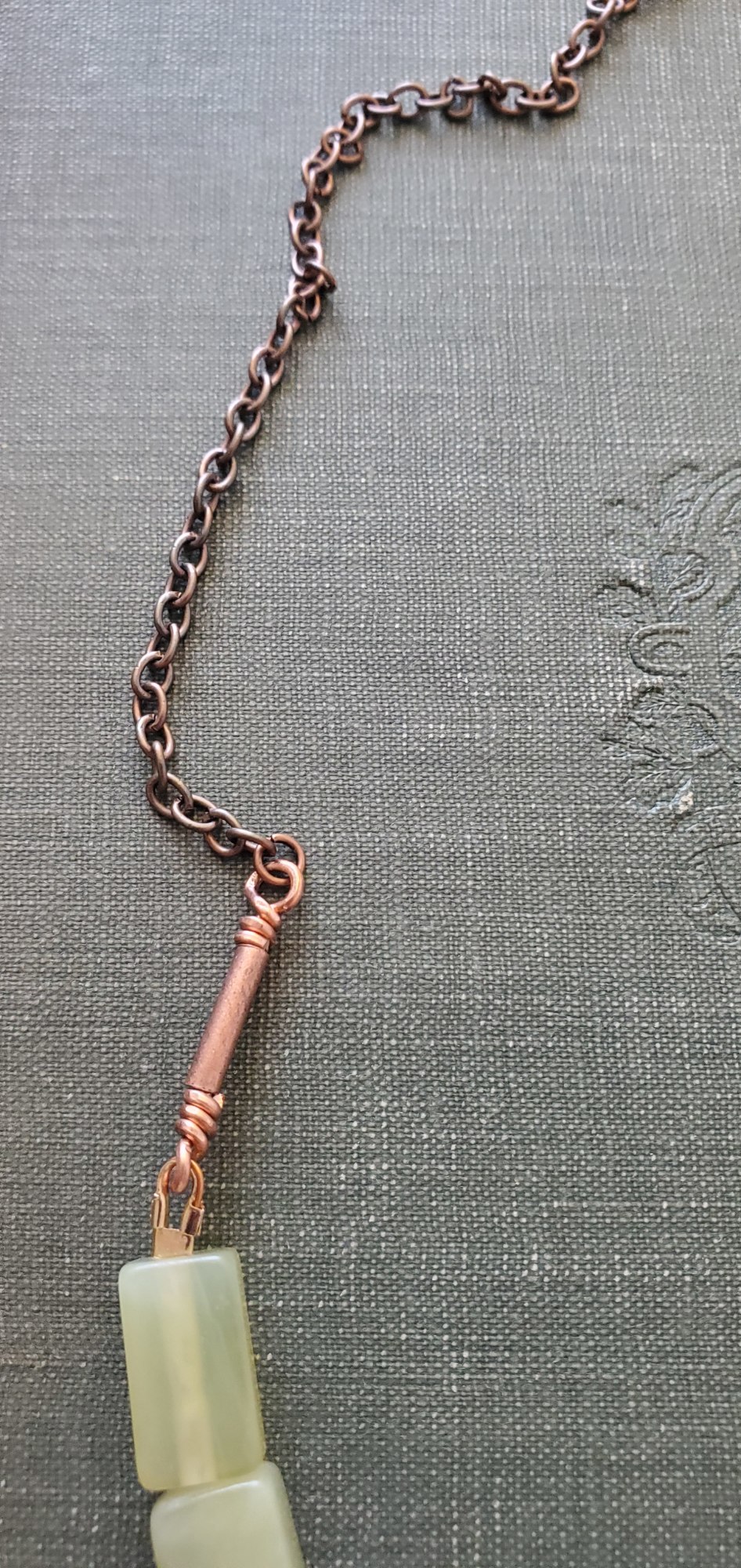 Inspired by vintage designs, this beautiful Jade stone necklace has the qualities of elegance and luxury. With copper and gild accents, this makes for a lovely addition to your collection. Handcrafted and one of a kind.