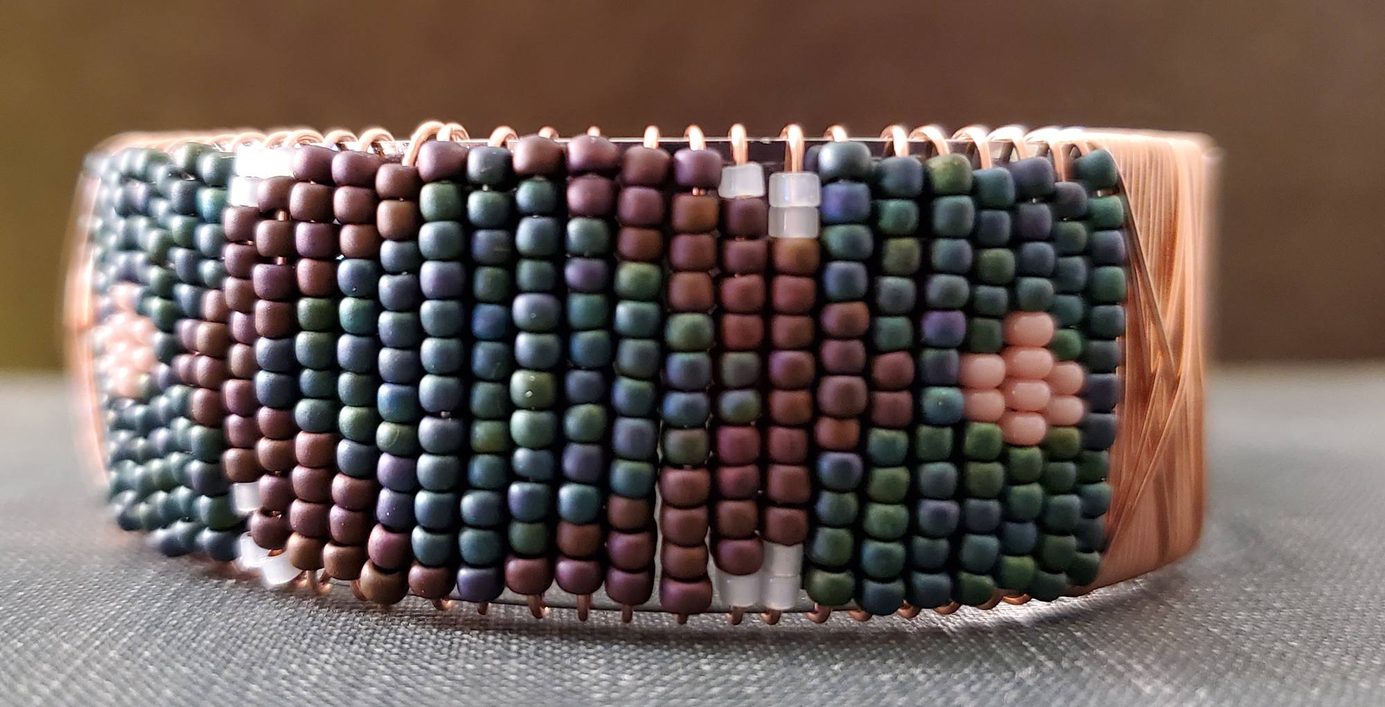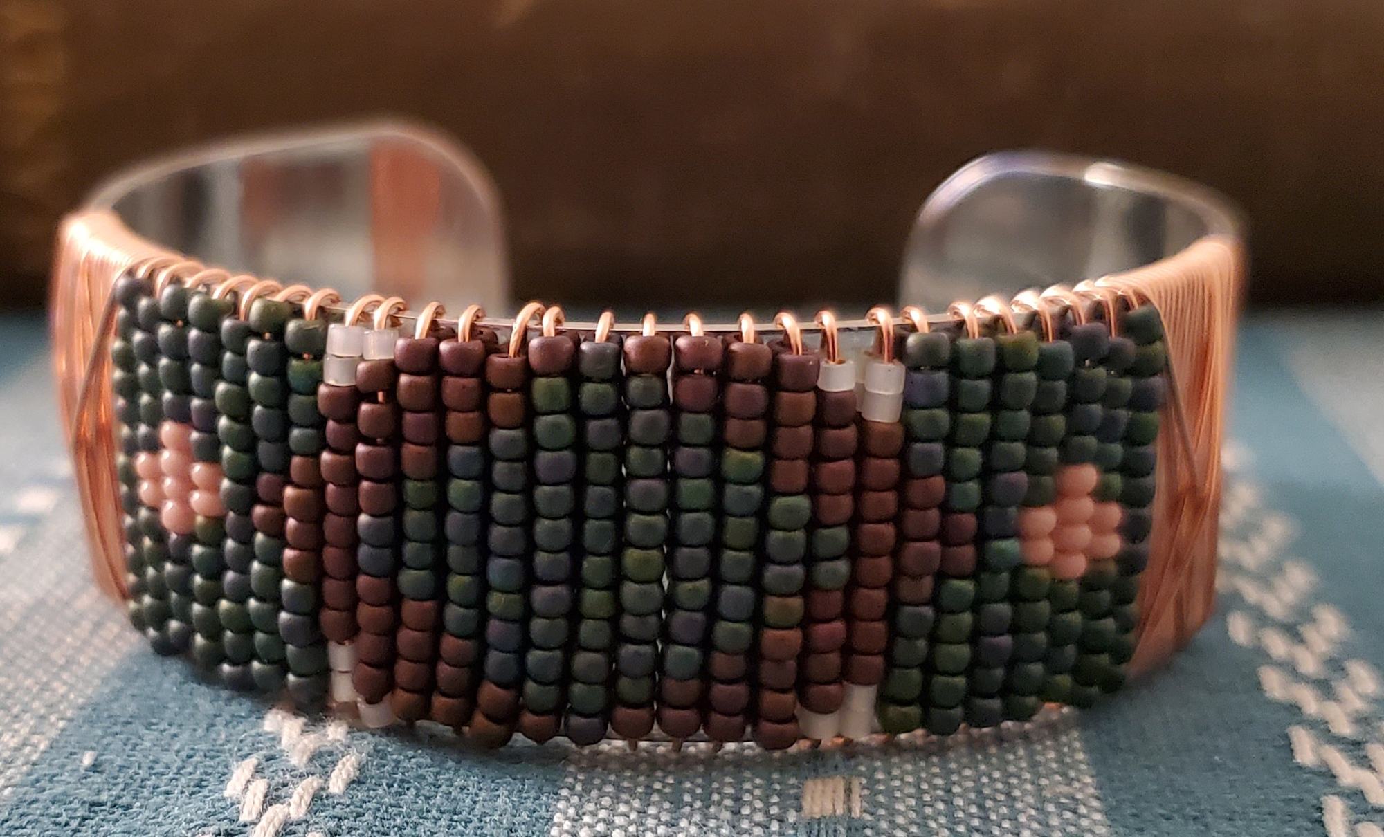 Delicate Vintage seed beads wrapped in Genuine Copper around a brass cuff. Elegant design inspired by the vast overlook from Sandia Peak, NM. Hypoallergenic and One of a kind.