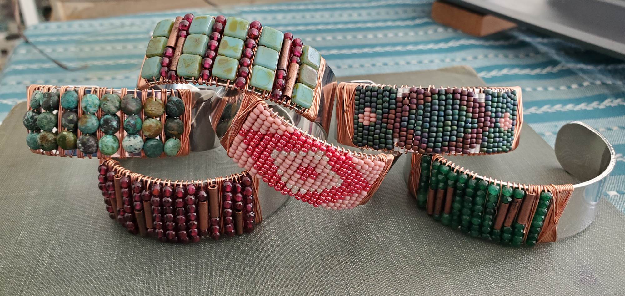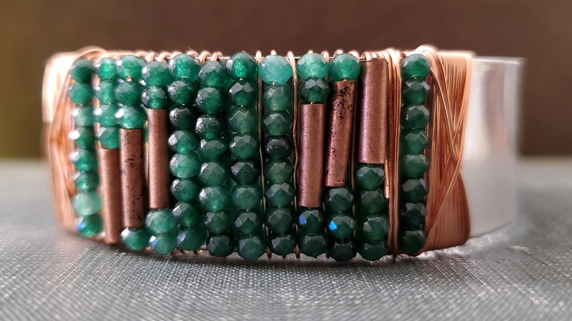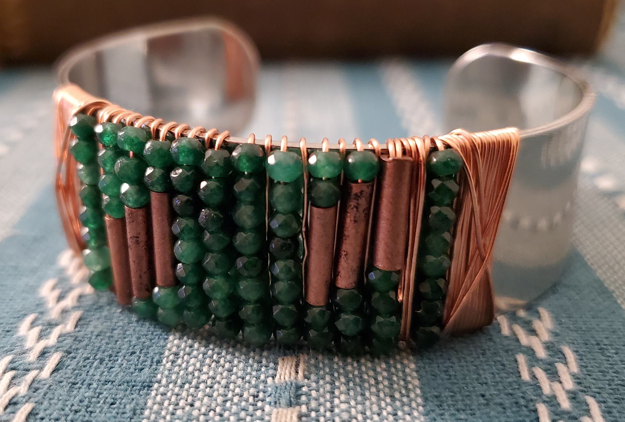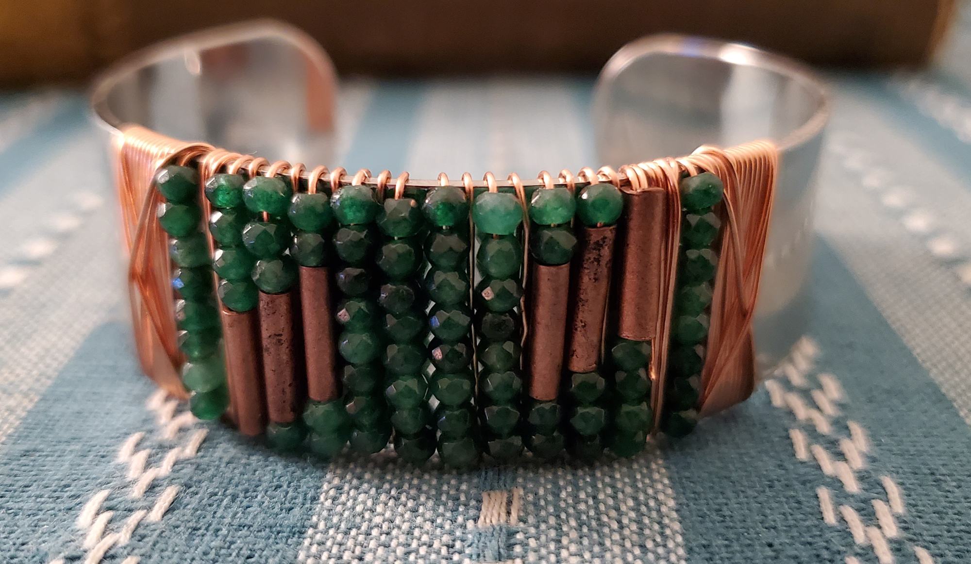 Genuine Green Onyx & Copper wrapped around a brass cuff. Elegant and only one of its kind. Inspired by the grass rising up from snow. Handcrafted and hypoallergenic.