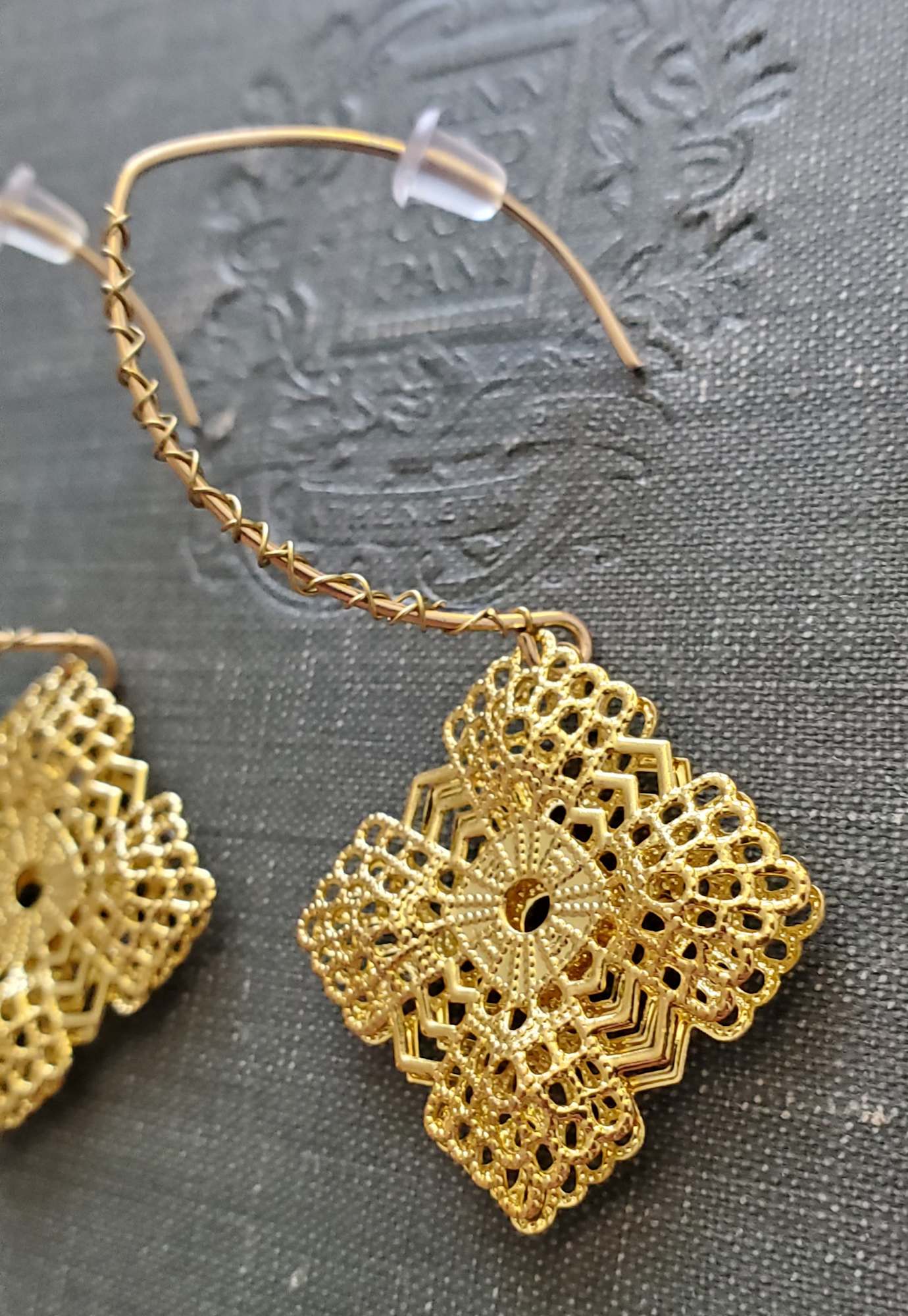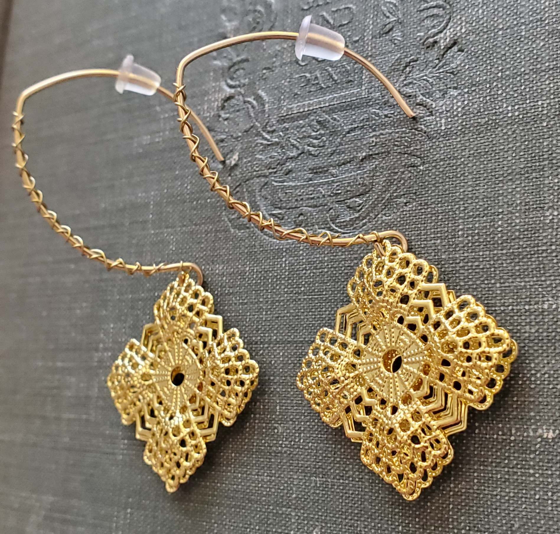 Bright gold-plated brass elegantly dangle from wire-wrapped hooks. Simple and chic. Hypoallergenic. Only one of it's kind.