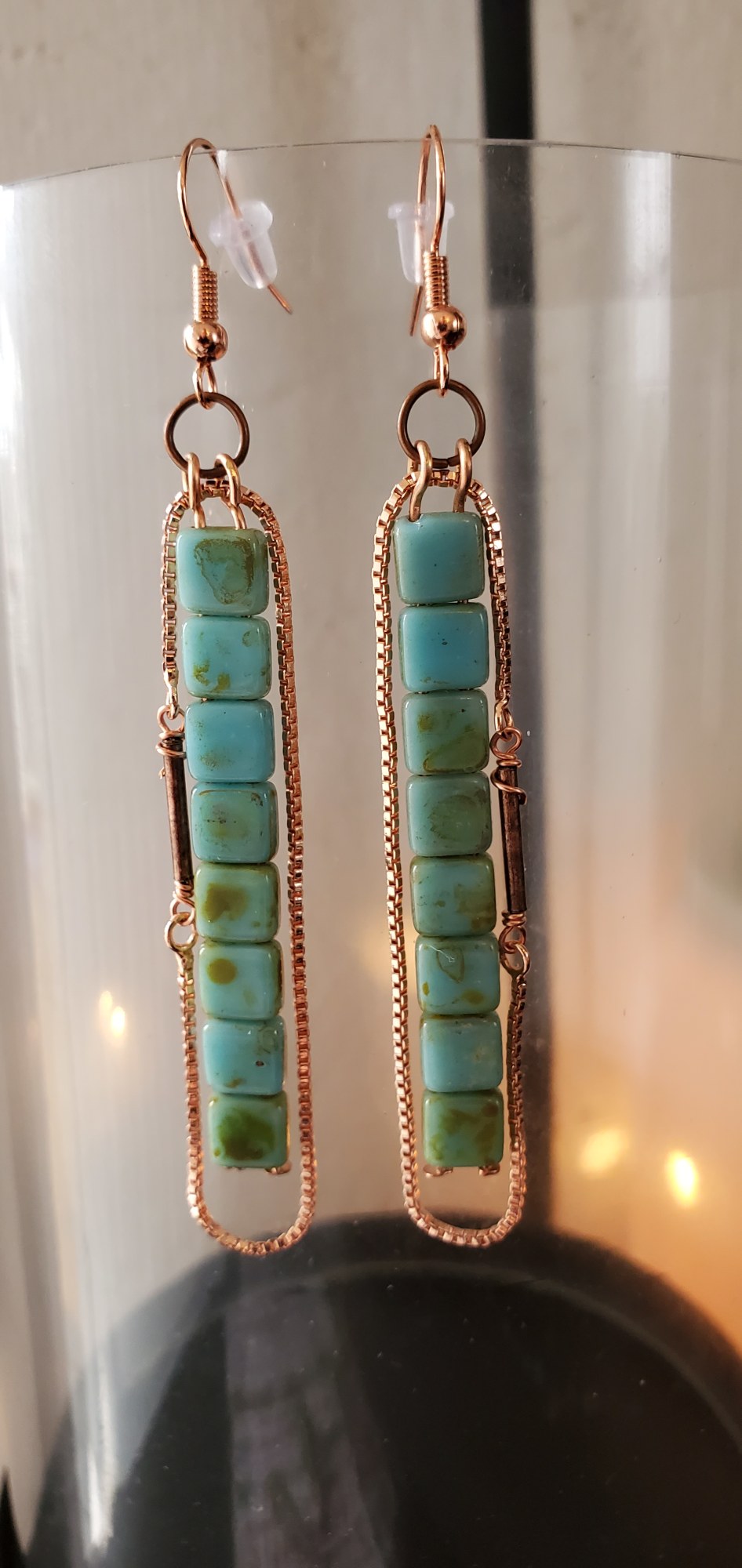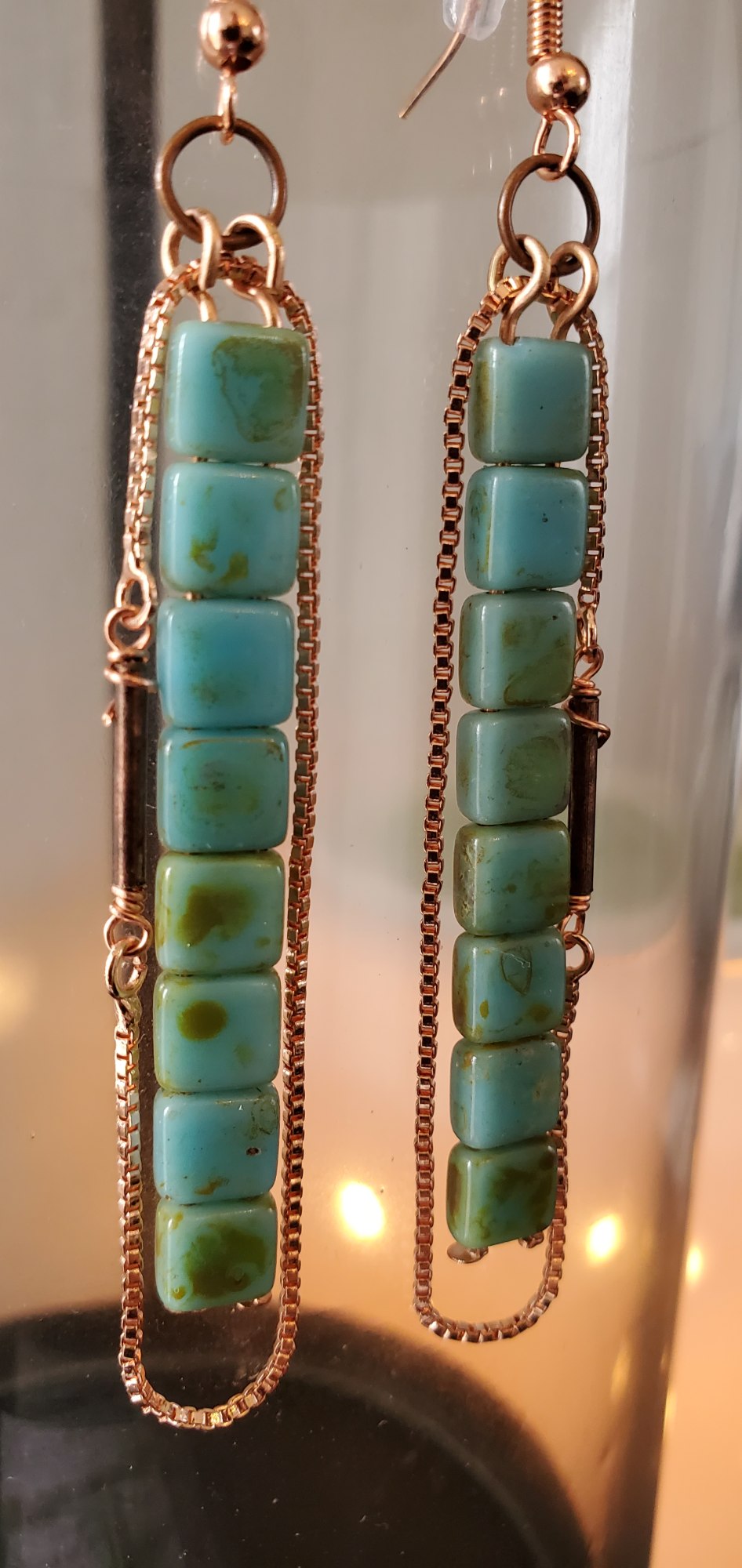 Beautiful Turquoise infused glass beads with genuine copper elements bring class with a linear style.