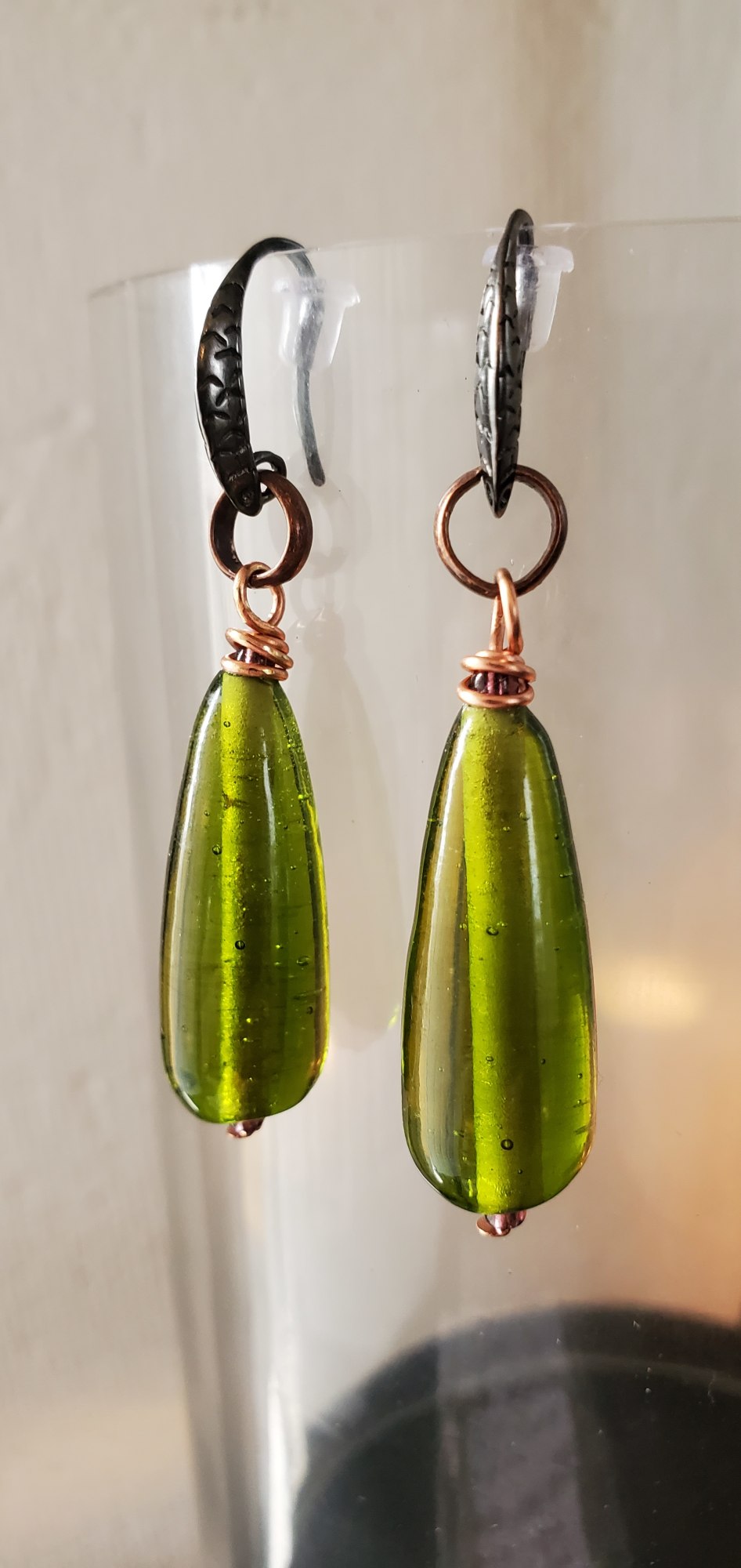 These stunning one of a kind earrings are handcrafted with vintage (circa 1950's) green glass beads. A beautiful addition to your collection. Hypoallergenic. Only one of its kind.