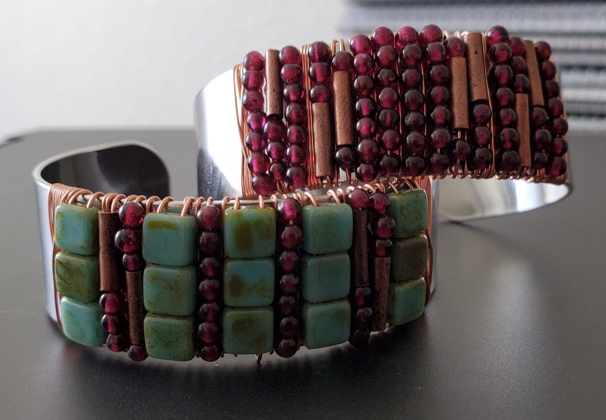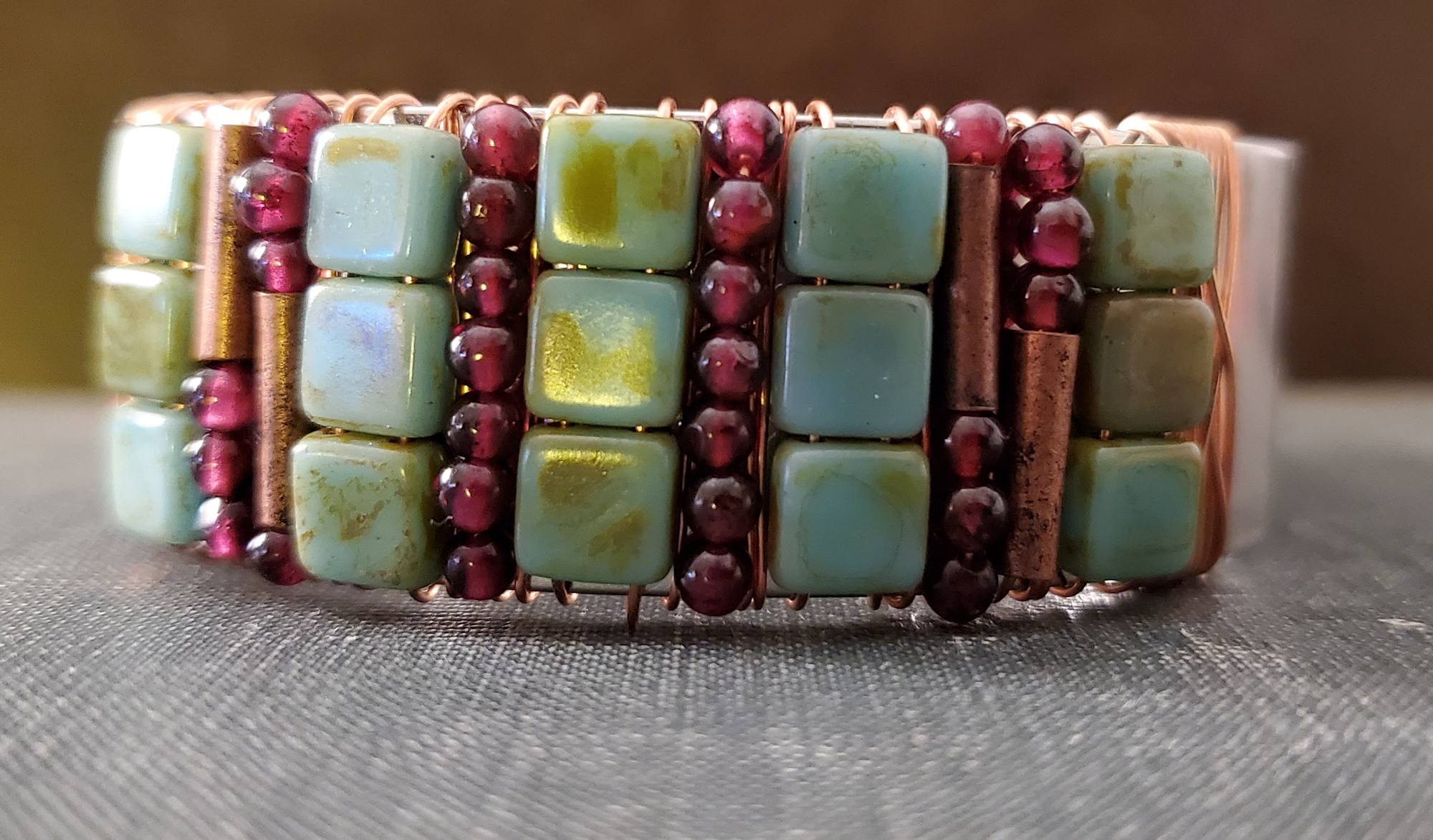 Genuine Garnet, Glass and Copper beautifully wrapped around a brass cuff. Elegant design inspired by the NM landscape. Handcrafted. Hypoallergenic. Only one of its kind.