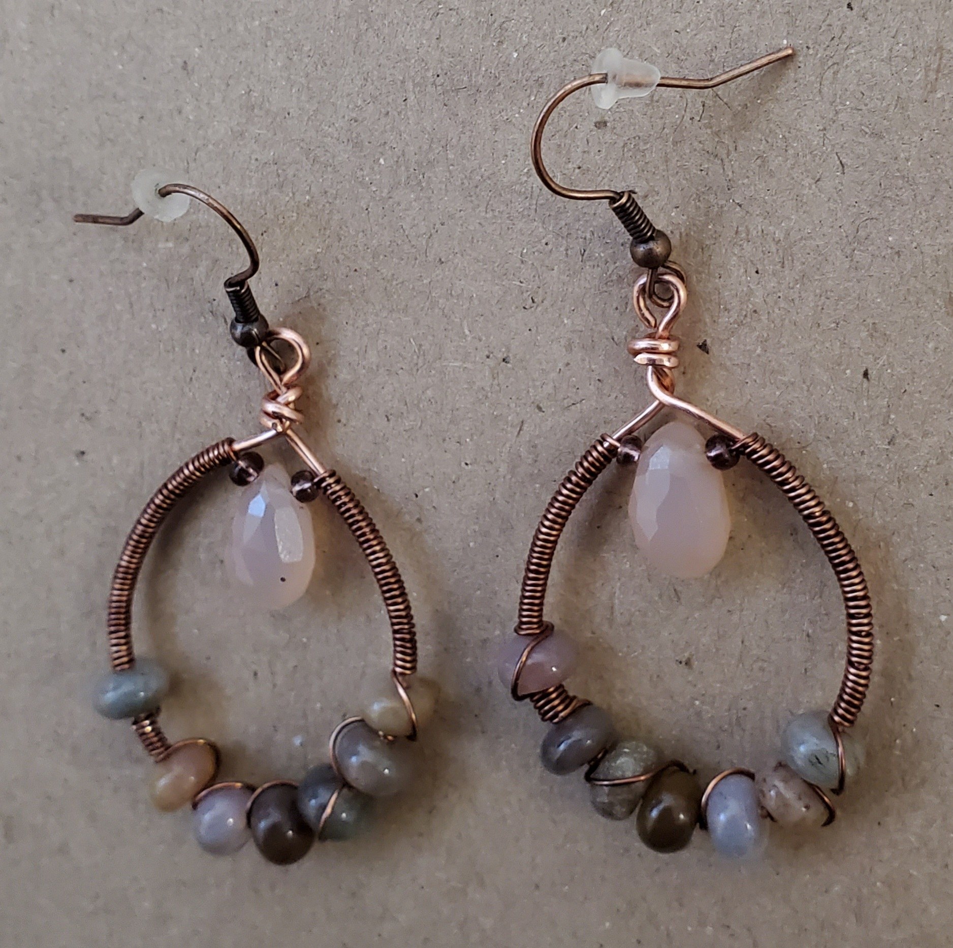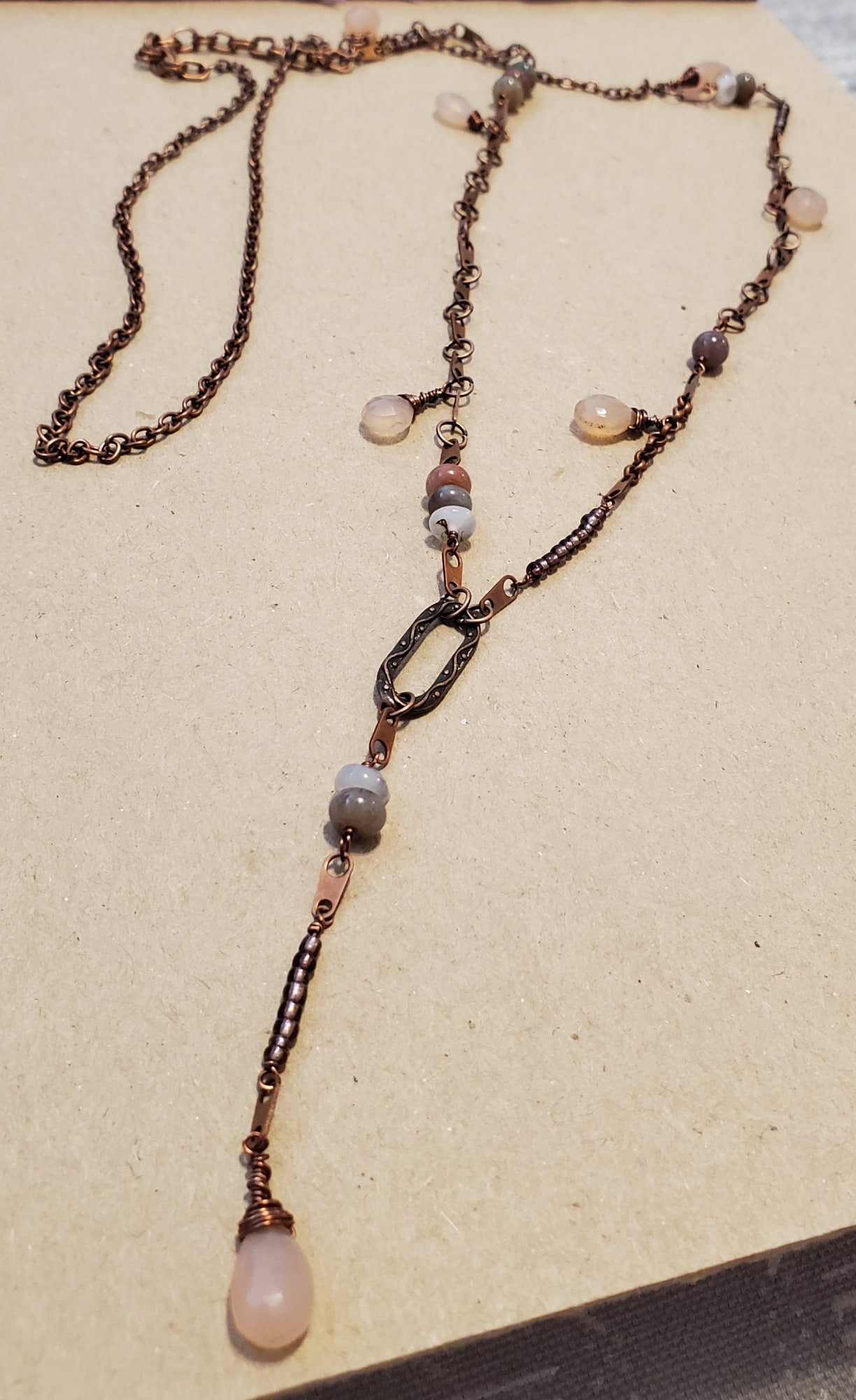 Vintage inspired design handcrafted with copper, peach, brown, taupe & mauve tones. Beautiful delicate color combination with wire wrapped Fancy Jasper and Chalcedony Beads paired with hints of rose quartz. Hypoallergenic. Only one of its kind.