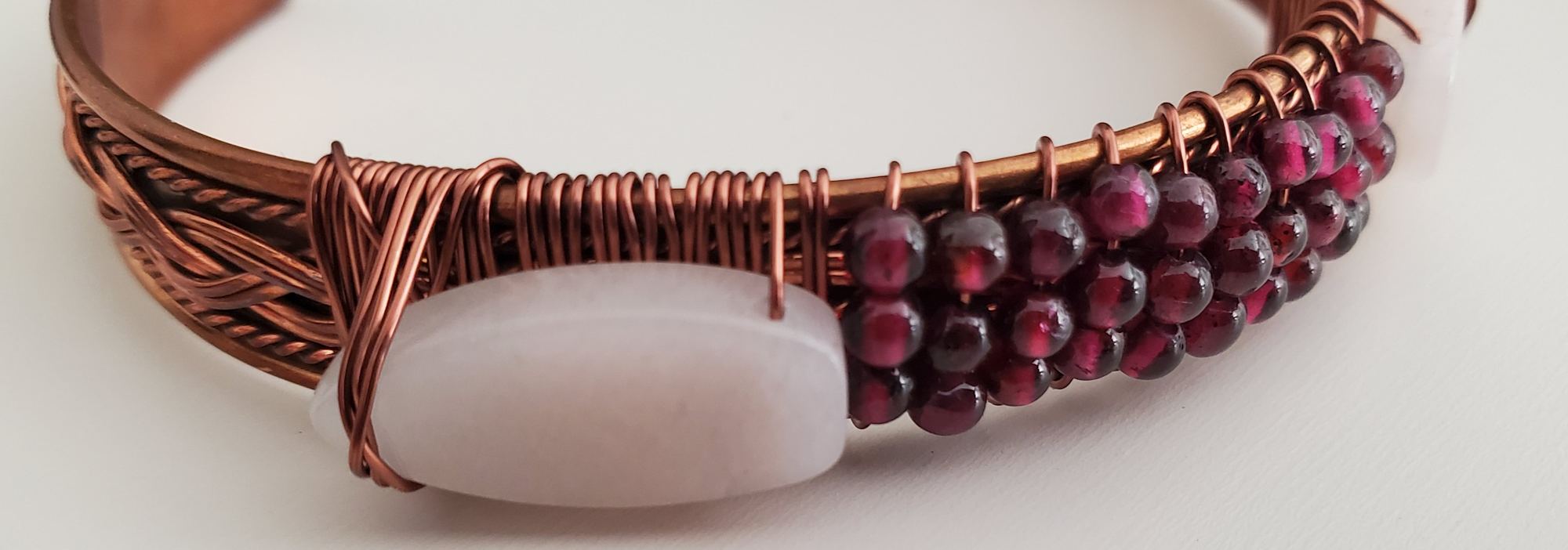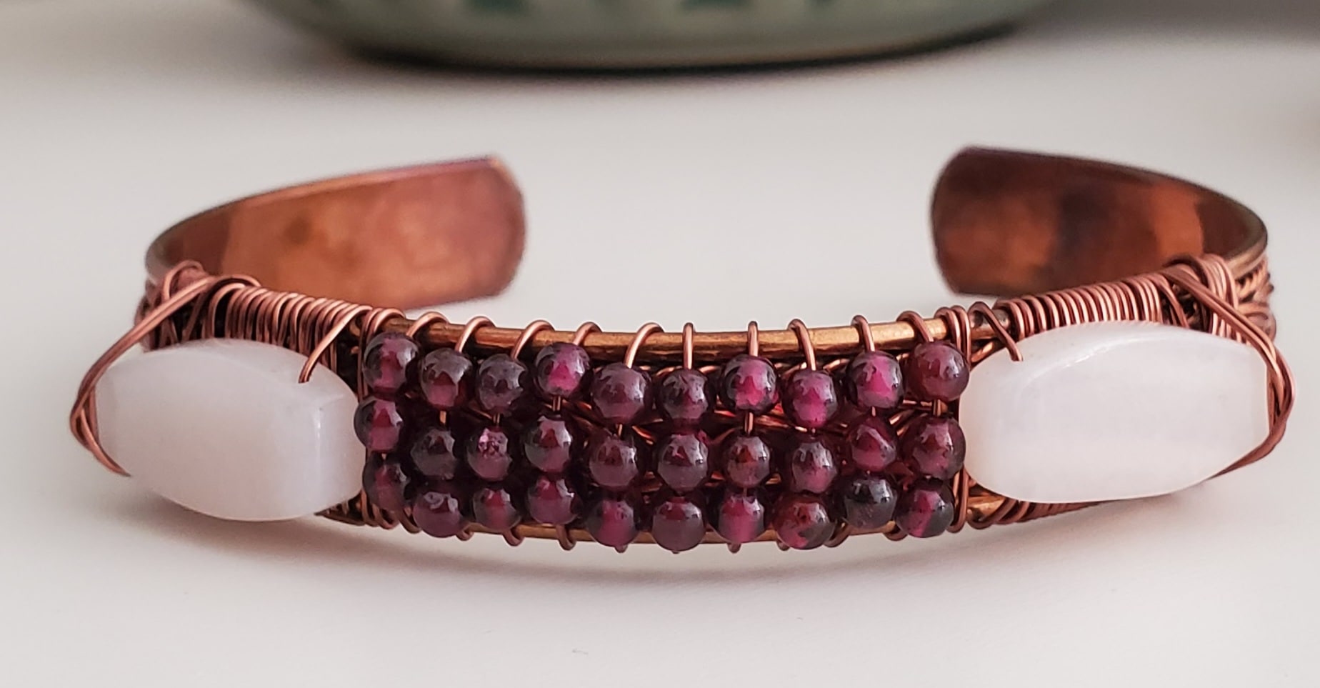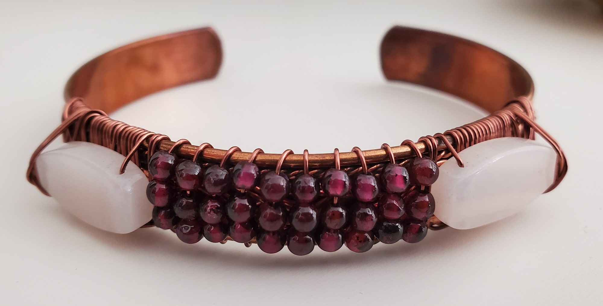 Genuine Garnet & Quartz beautifully wrapped around a Copper cuff. Handcrafted. Inpsired by native heritage. Hypoallergenic. Only one of its kind.
