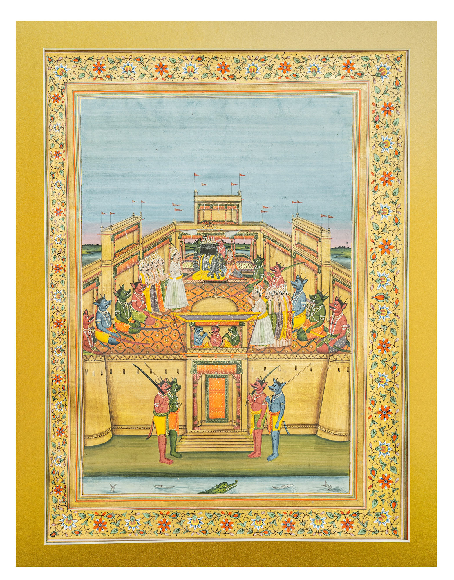 In a grand council chamber, Ravan sits enthroned, surrounded by rakshasa ministers who, with horned and fanged visages, boast about defeating Ram’s forces. Their arrogance fills the court, even as signs of impending doom begin to surface. At the far side, Vibhishan enters with humility, accompanied by virtuous advisors. Urging dharma, he warns Ravan of Ram’s divine power—his voice a calm foil to the bluster of the other generals. The contrast between Vibhishan’s reason and the court’s pride signals the looming fall of Lanka. The golden palace, fortified and adorned with pennants, musicians, and vigilant guards, reflects the Mughal Rajput fusion typical of the Benares school. A companion text in Devanagari script, likely from Yuddha Kand of the Ramcharitmanas, echoes the drama depicted on the front.