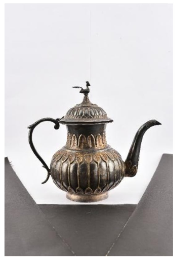 This ewer/water vessel is made of parcel-gilt silver and features a bulbous body. The body, spout, and neck are adorned with chased borders of acanthus leaves, while a curved handle adds to its elegance. A domed lid fits over the neck and is topped with a peacock finial resting on a cast lotus rosette.