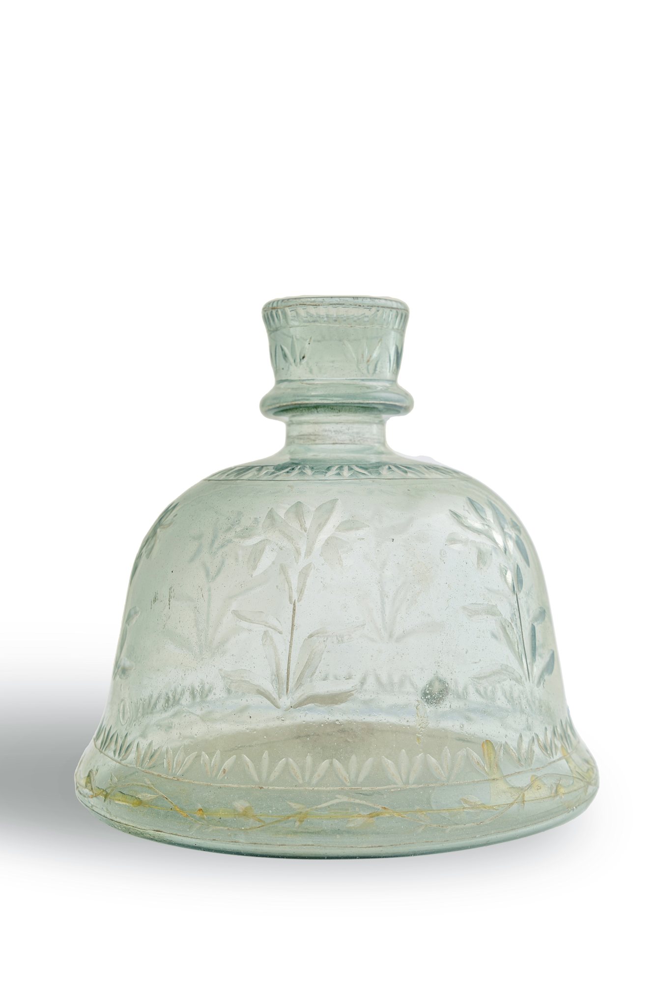 With its glassy brilliance and softly rounded form, this distinctive huqqa base offers a striking variation on traditional Mughal glassware. Unlike the typical bell-shaped bases, this piece flares outward into a broad, flattened foot without the usual indentation at the waist, giving it a deceptively compact, almost squat appearance. Dating to the 18th century, it represents a transitional form between spherical and bell-shaped types seen throughout the period. Free-blown and tooled at the pontil, its surface is decorated with delicately wheel-cut floral sprays framed by geometric bands. A similar example is illustrated in Mughal Glass: A History of Glassmaking in India, p. 189.