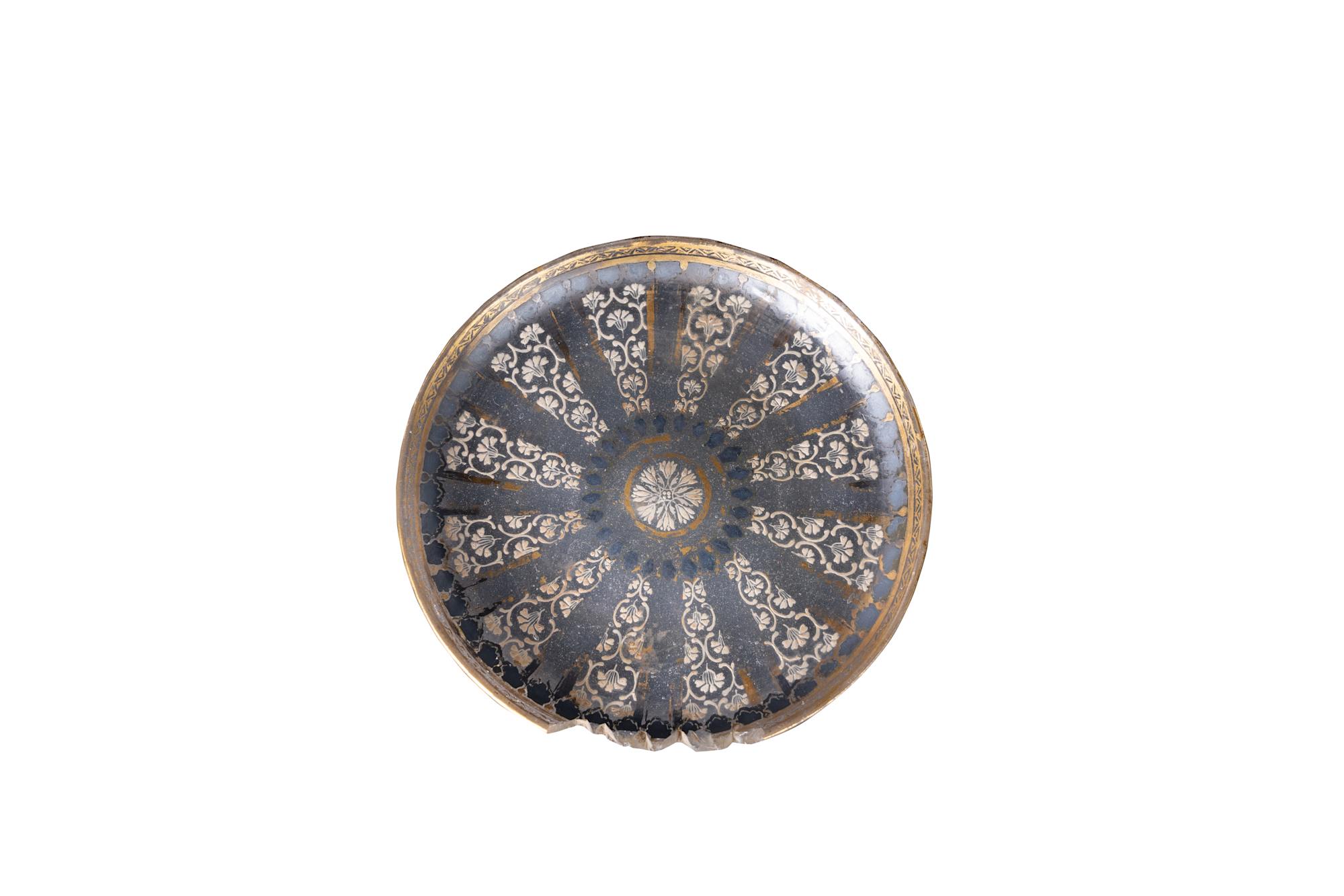 Enveloped in gold and crafted with delicacy, this free-blown glass saucer exemplifies the technical finesse and aesthetic sophistication that flourished under imperial patronage. The design blossoms from a central floral medallion, its gilded petals radiating in perfect symmetry. What sets this piece apart is its striking use of blue-painted accents, interspersed between the gilded motifs in a rhythmic alternation that adds dramatic contrast to the design. The rim features a refined border, painted and gilded with repeating scalloped motifs. Though minor chipping marks its edge, these signs of age only heighten its aura—evidence of a legacy both fragile and enduring. A similar example is published in Mughal Glass, p. 245.