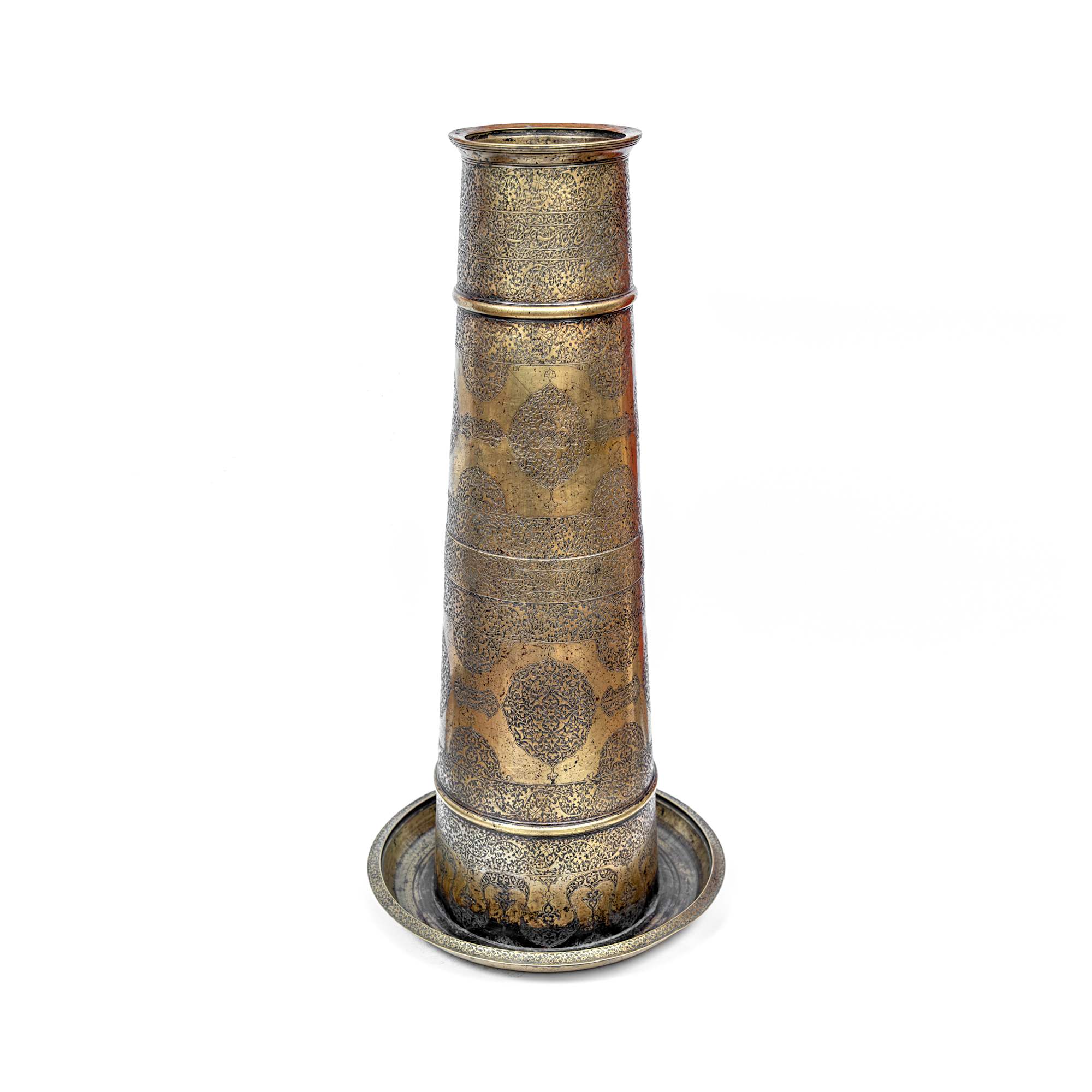 Commanding in scale and rich in spiritual symbolism, this monumental engraved brass torch stand represents one of the most distinguished and rare survivals of 16th-century Safavid metalwork. Rising to an impressive height of 34 inches, it is the only known example of this scale, outshining even the 24-inch version in the Qatar Museums Collection. Structurally, the piece closely echoes a distinctive group of Safavid sham’dans (lampstands) that began to flourish in Iran during the early 1500s. A notable comparison can be drawn with a related example housed in the Victoria & Albert Museum, London (inv. no. 790-1901), which features a similar cylindrical body crowned by an upper flange designed to support a domed cover— ingeniously crafted to flip over and serve as an oil reservoir. This intelligent design reveals the object’s duality: both functional and symbolic, utilitarian and transcendent. What sets this particular torch stand apart, beyond its rare size, is its superbly engraved surface, alive with a dense tangle of interlacing vegetal scrolls, rhythmic arabesques, and deeply meaningful poetic inscriptions. The background has been meticulously cross-hatched and blackened; a technique highly characteristic of Safavid metalwork from the 1560s to the 1580s. This stylistic hallmark allows it to be securely dated and confidently linked to other celebrated examples, such as the pieces preserved in the State Hermitage Museum, St. Petersburg (inv. no. IR 2202) and the Hussein Afshar Collection. Encircling its surface are beautifully rendered verses by the great Persian poet Hafiz Shirazi, whose works frequently appear on objects intended for devotional use. These verses are far from mere decoration. They evoke the Sufi ideals of divine love, inner awakening, and spiritual radiance, deeply aligning with the lampstand’s function as a bearer of light. In essence, it becomes a visual and poetic embodiment of spiritual illumination, bridging the physical world and metaphysical contemplation. Many such torch stands were presented as votive offerings to Shi’i shrines, where they served both ritualistic and symbolic roles. Not only did they physically light the interiors of shrines, but their inscribed messages and majestic forms encouraged inward reflection, casting a spiritual light that echoed the flicker of their flames.