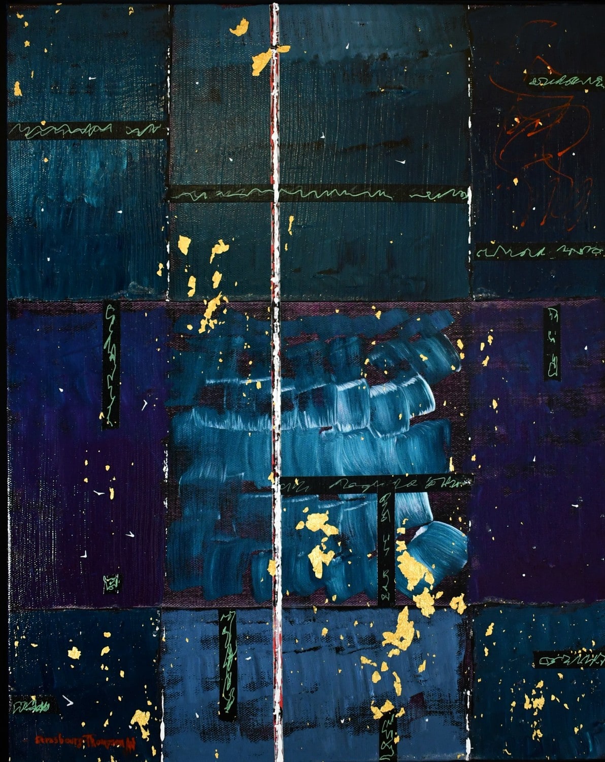 - Acrylic, 24K Gold Leaf, Interference powder, tape, asemic writing, on 20 x 16 x 2 canvas