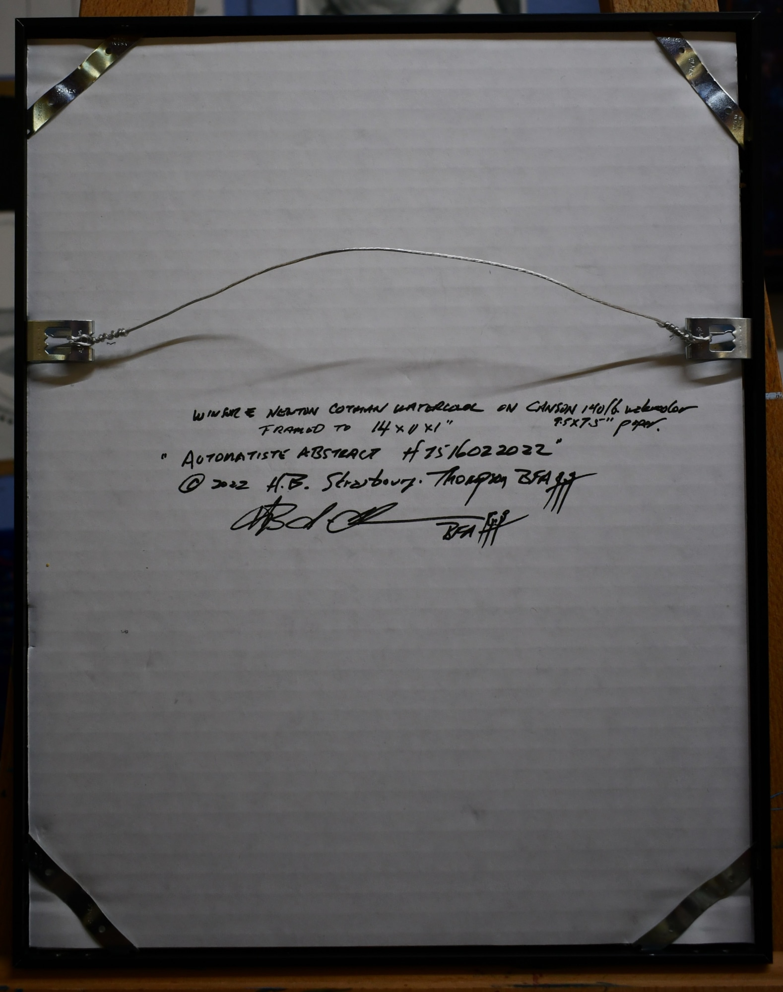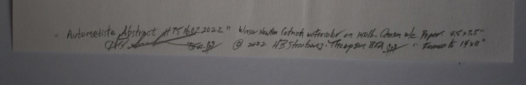 - Signature: On face lower "Strasbourg-Thompson". On back or paper "HB Strasbourg-Thompson BFA, anagram" On Back of Framing "HB Strasbourg-Thompson BFA, anagram"