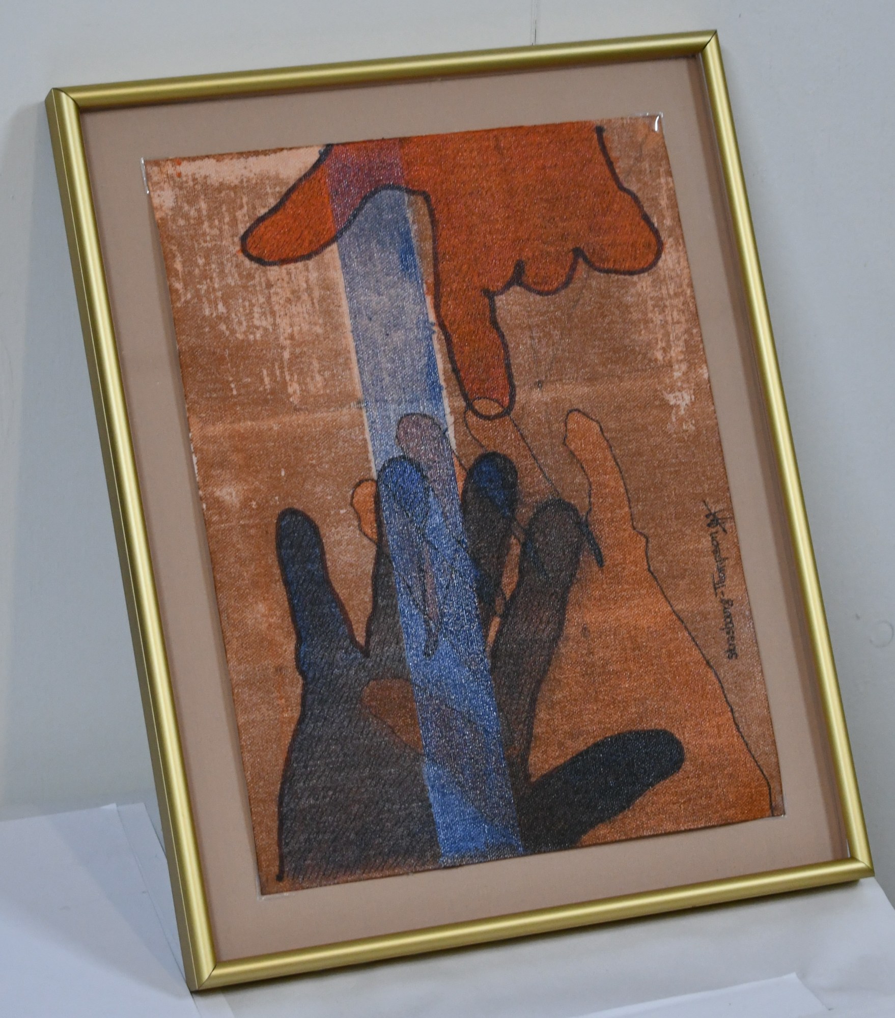 - Acrylic, acrylic mediums, w/n Fineliner black pens, Golden isolation coat, w/n gloss & satin varnish on 12" x 9" Fredrix archival canvas mounted on a/f matboard and framed with frosted gold metal frame and glass.
