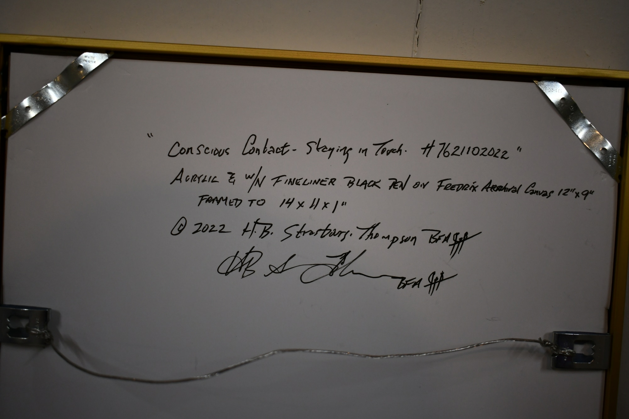 - Acrylic, acrylic mediums, w/n Fineliner black pens, Golden isolation coat, w/n gloss & satin varnish on 12" x 9" Fredrix archival canvas mounted on a/f matboard and framed with frosted gold metal frame and glass.