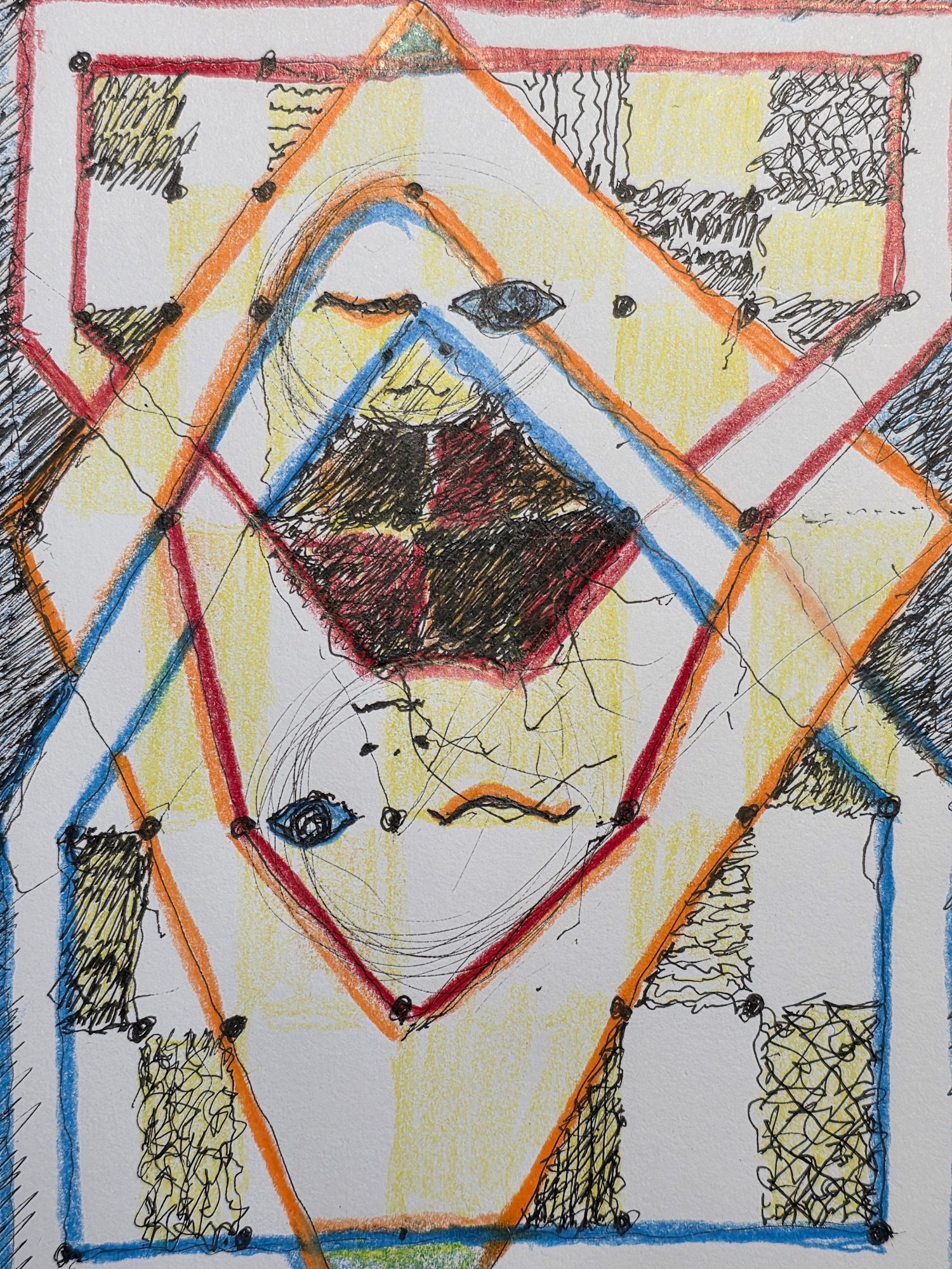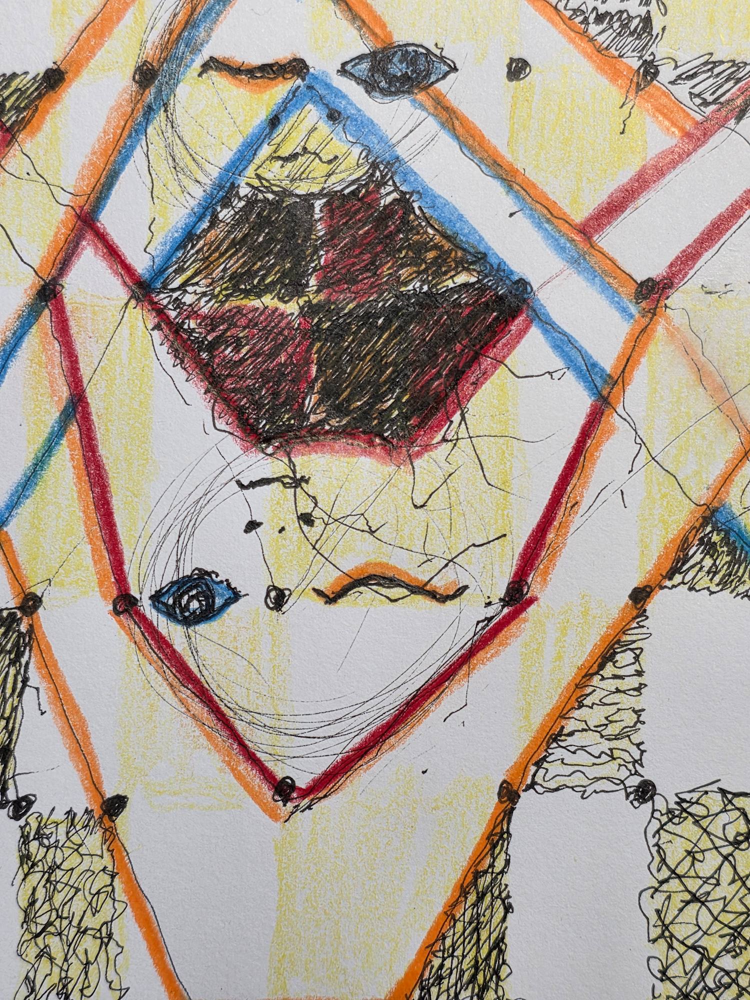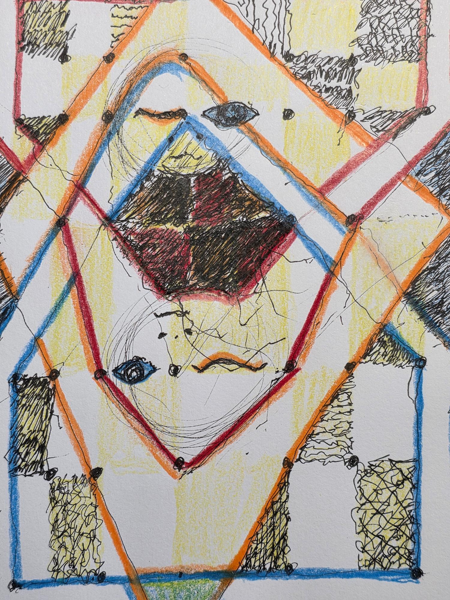 - W/N Fineliner black artist pigment pens, Prismacolor Premium Artist Grade colored pencils, White acrylic on 75lb. A/F paper