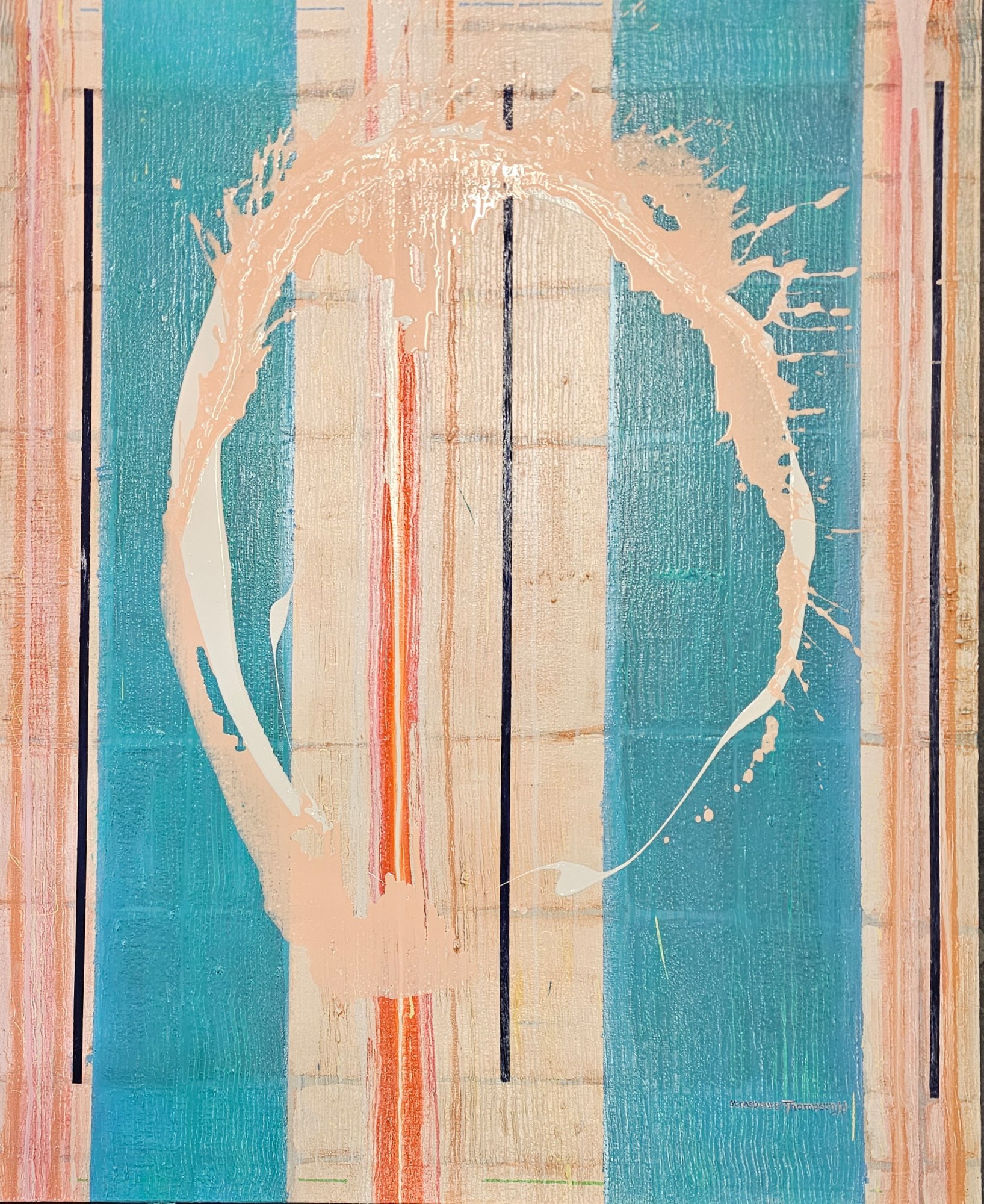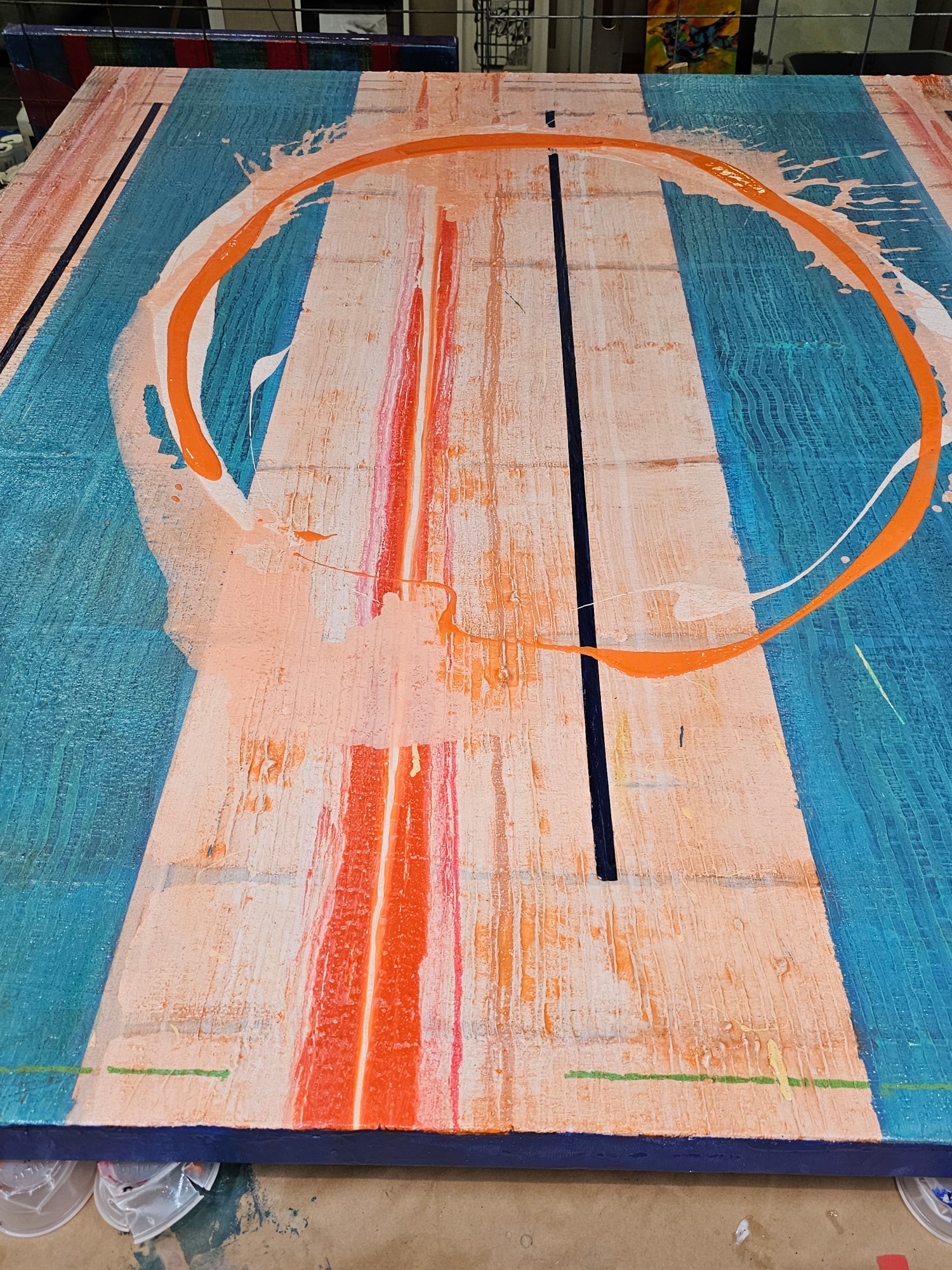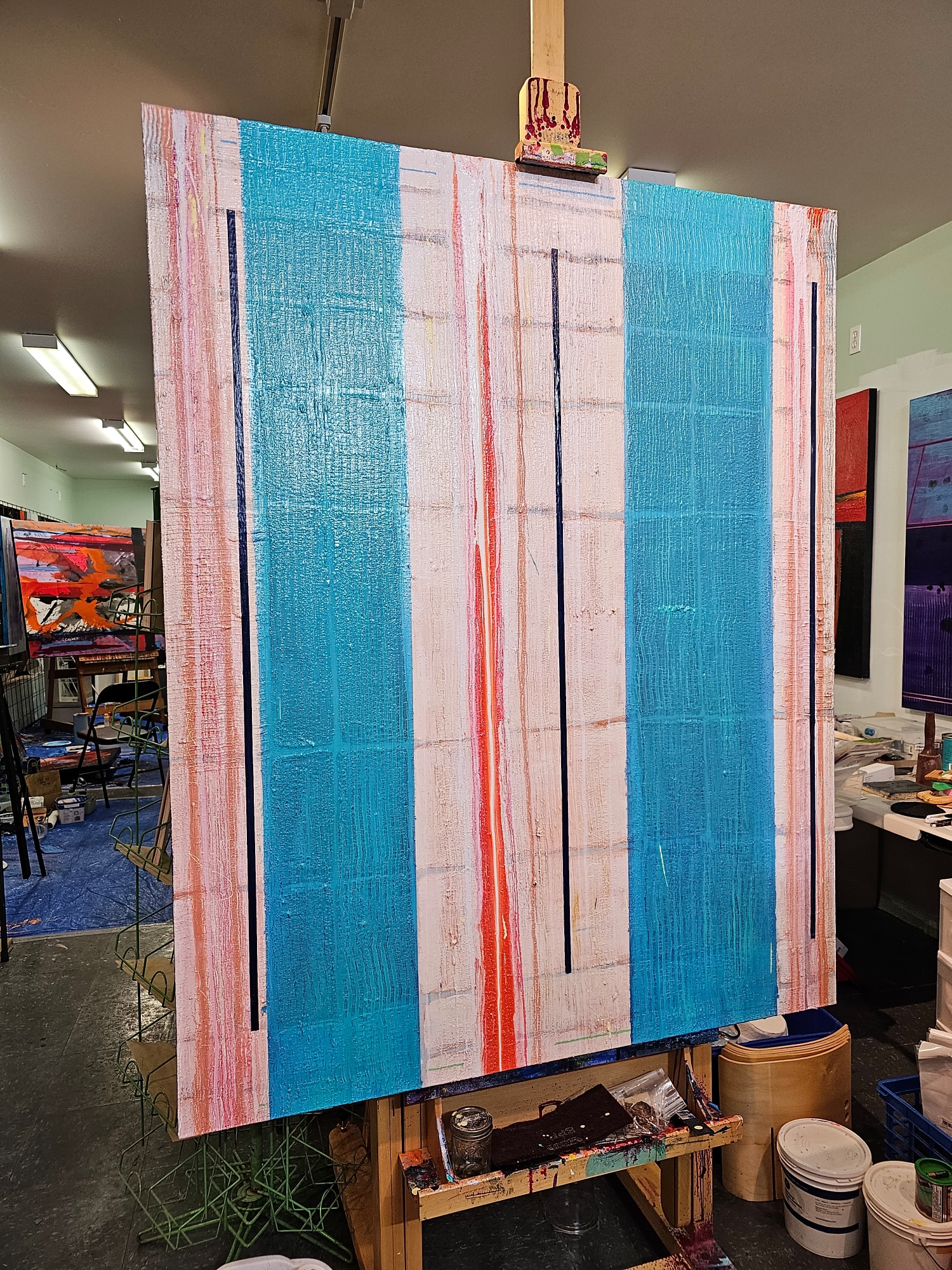- Acrylic, Glass Bead Gel, W/N artist pigment black Fineliner pens, Powdered Artist Dry Pigments, Irridescent Powdered Artist dry pigments, 1/2" masking tape overpainted with acrylic, Posca markers, Acrylics, Acrylic mediums on 60" x 48" x 2" canvas