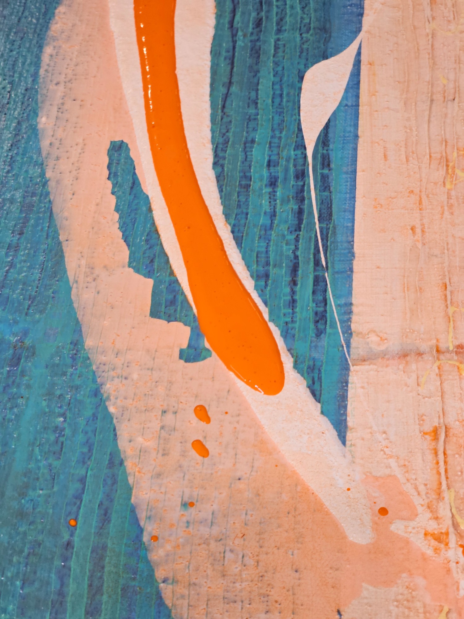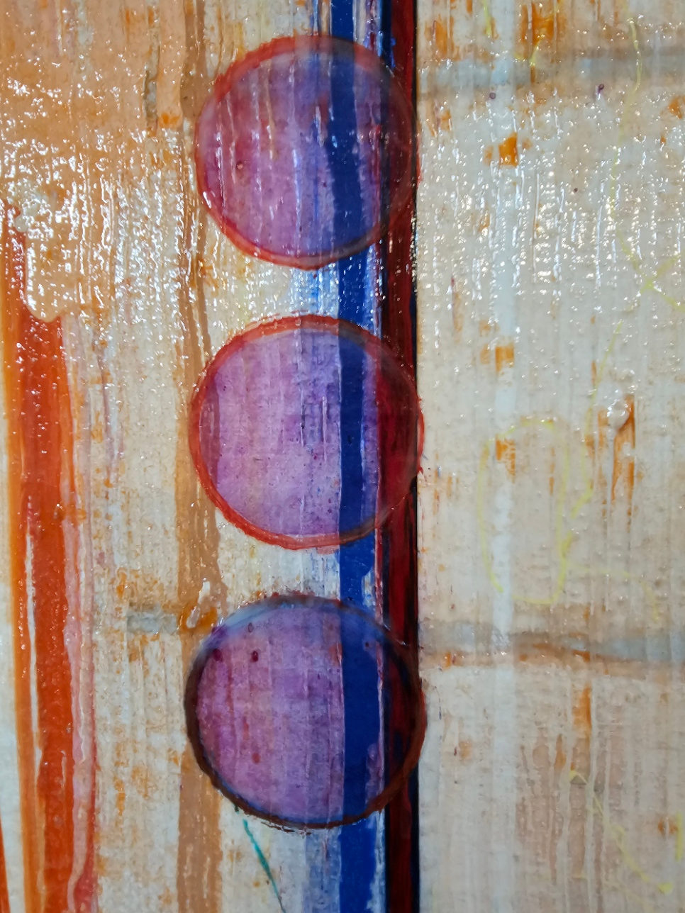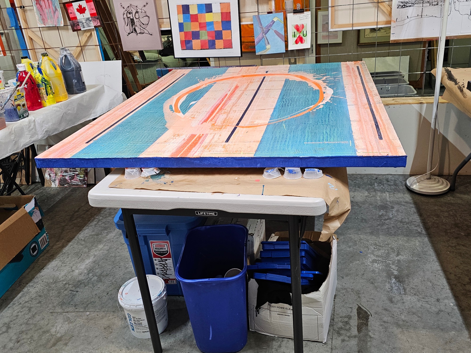 - Acrylic, Glass Bead Gel, W/N artist pigment black Fineliner pens, Powdered Artist Dry Pigments, Irridescent Powdered Artist dry pigments, 1/2" masking tape overpainted with acrylic, Posca markers, Acrylics, Acrylic mediums on 60" x 48" x 2" canvas