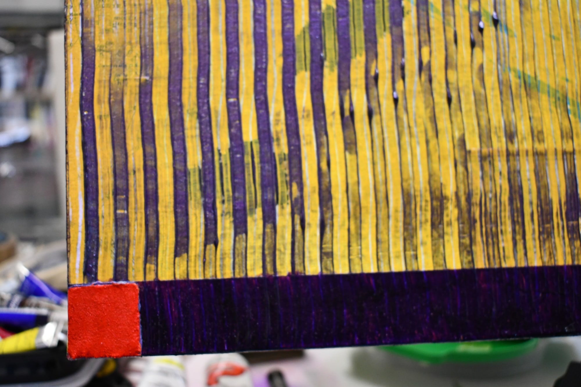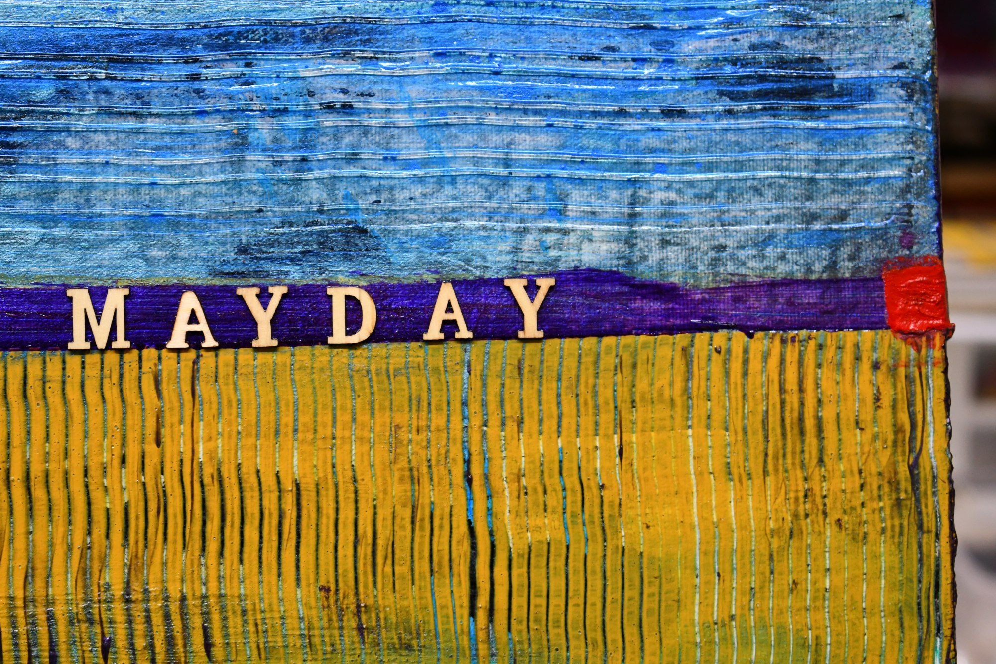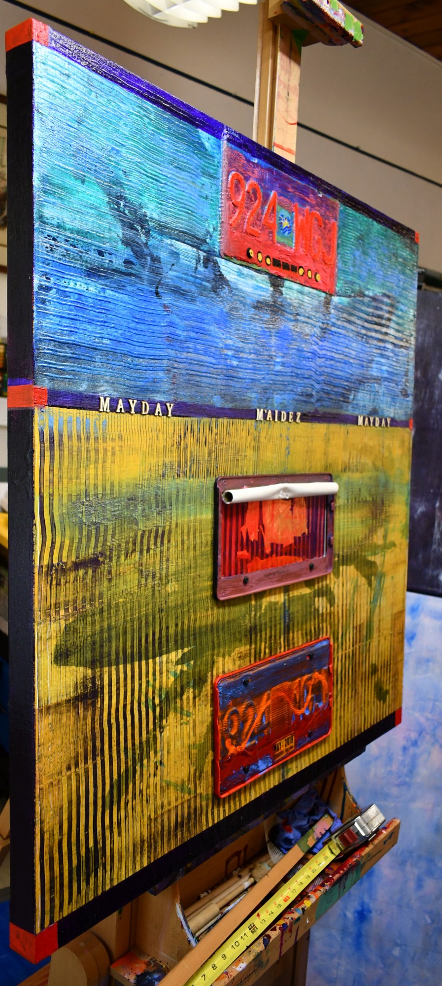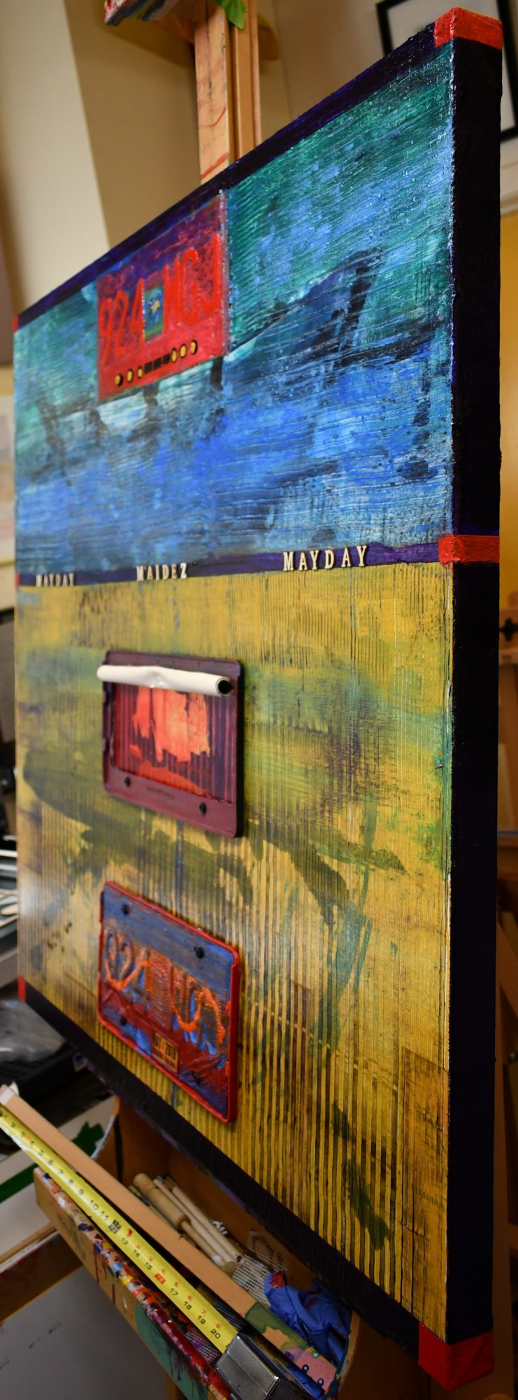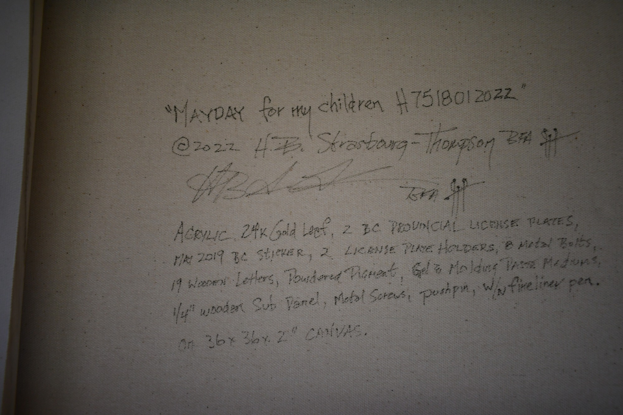 - Acrylic, 24k gold leaf, 2 BC provincial license plates, May 2019 BC sticker, 2 license plate holders, 8 metal bolts, 19 wooden letters, powdered pigment, gel & molding paste mediums, 1/4" wooden sub panel, metal screws, pushpin on 36 x 36 x 2" canvas.