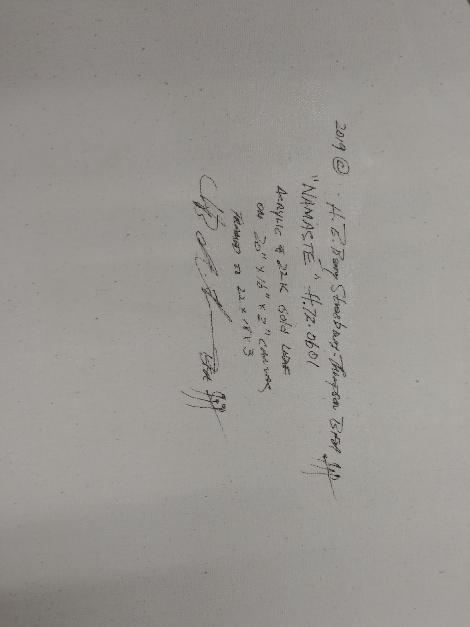 - Signature: signed "Strasbourg-Thompson" lower right face and "Namaste" lower left face