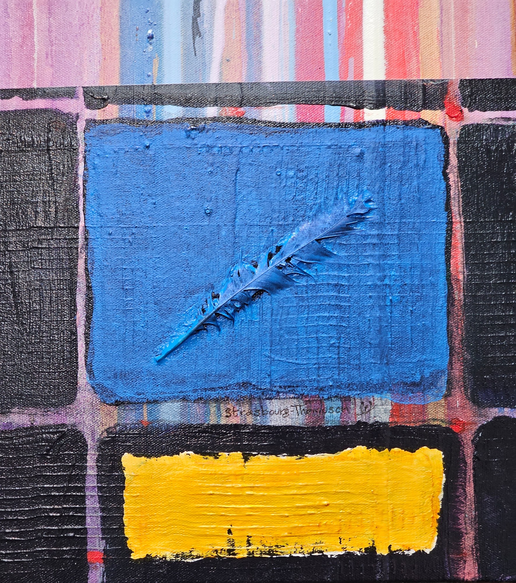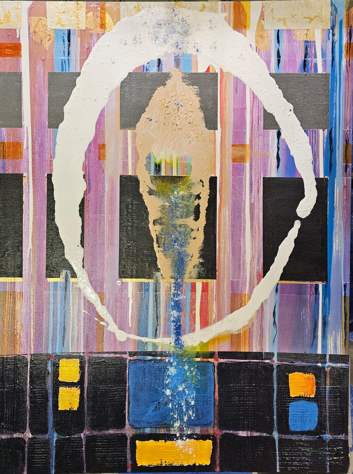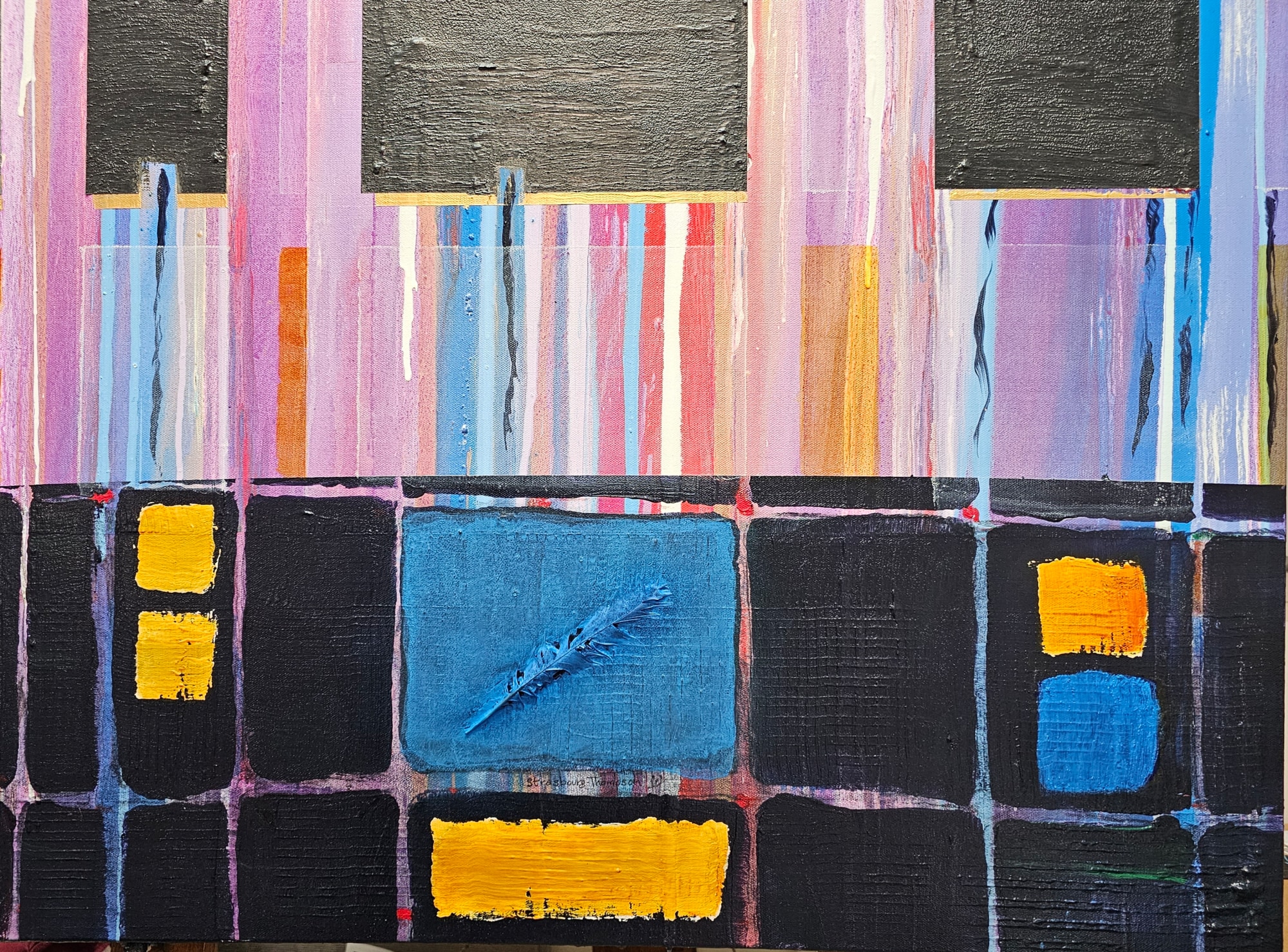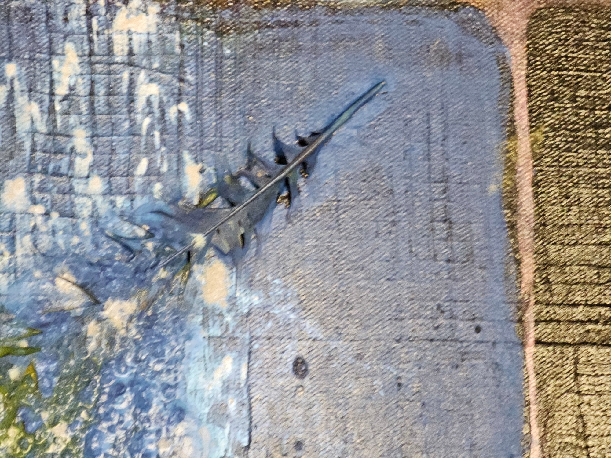 - Acrylic, Acrylic mediums, Crow Feather, 22k Gold Leaf, White & Black & Irridescent Blue powdered pigment, India Ink, Charcoal on 48" x 36" x 3" canvas