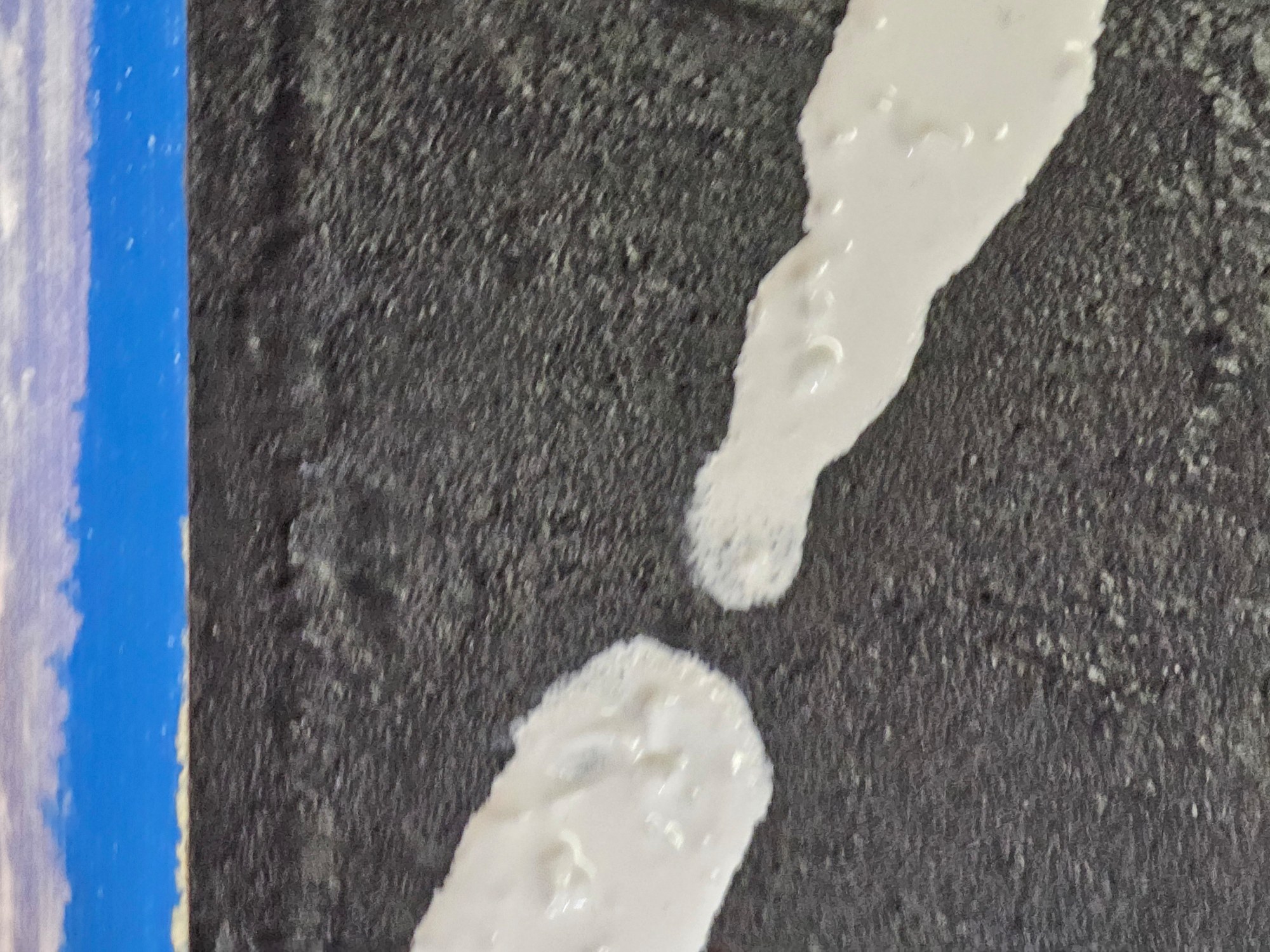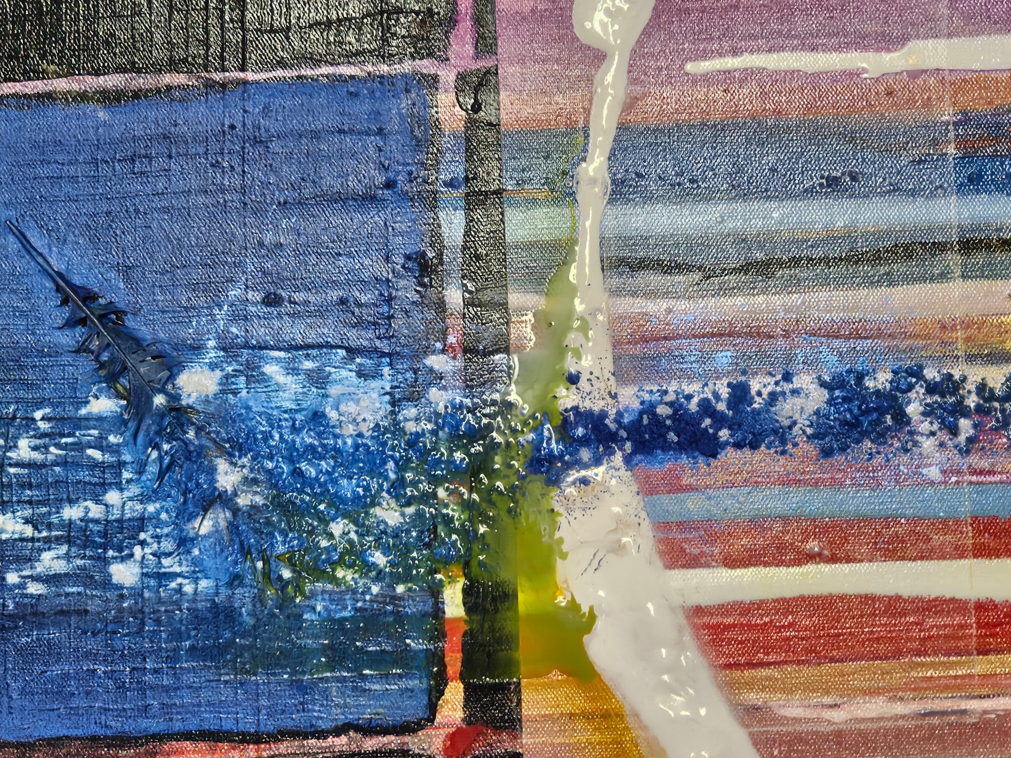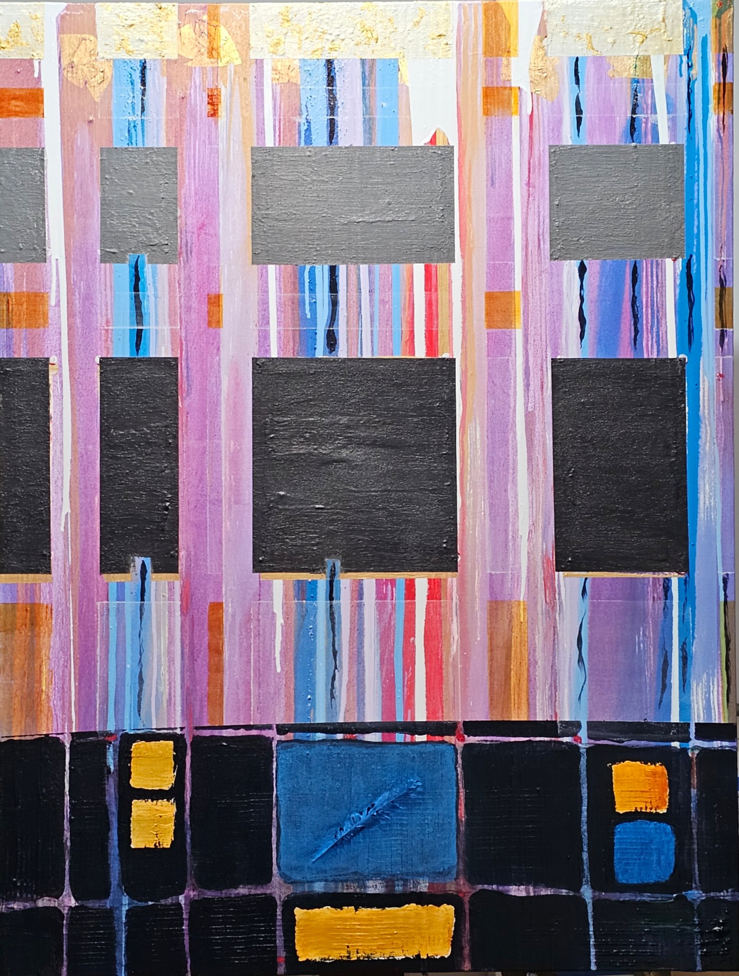 - Acrylic, Acrylic mediums, Crow Feather, 22k Gold Leaf, White & Black & Irridescent Blue powdered pigment, India Ink, Charcoal on 48" x 36" x 3" canvas