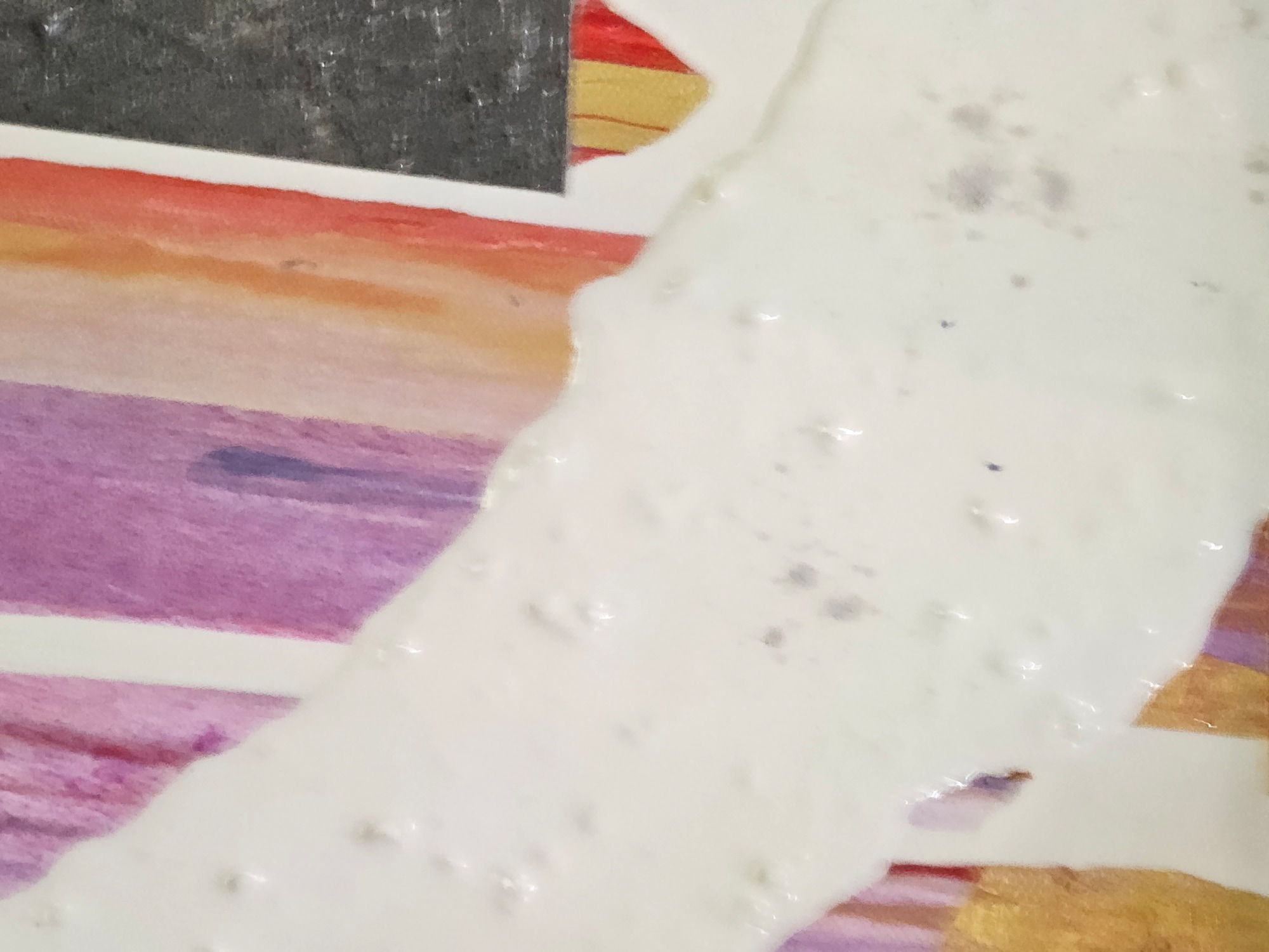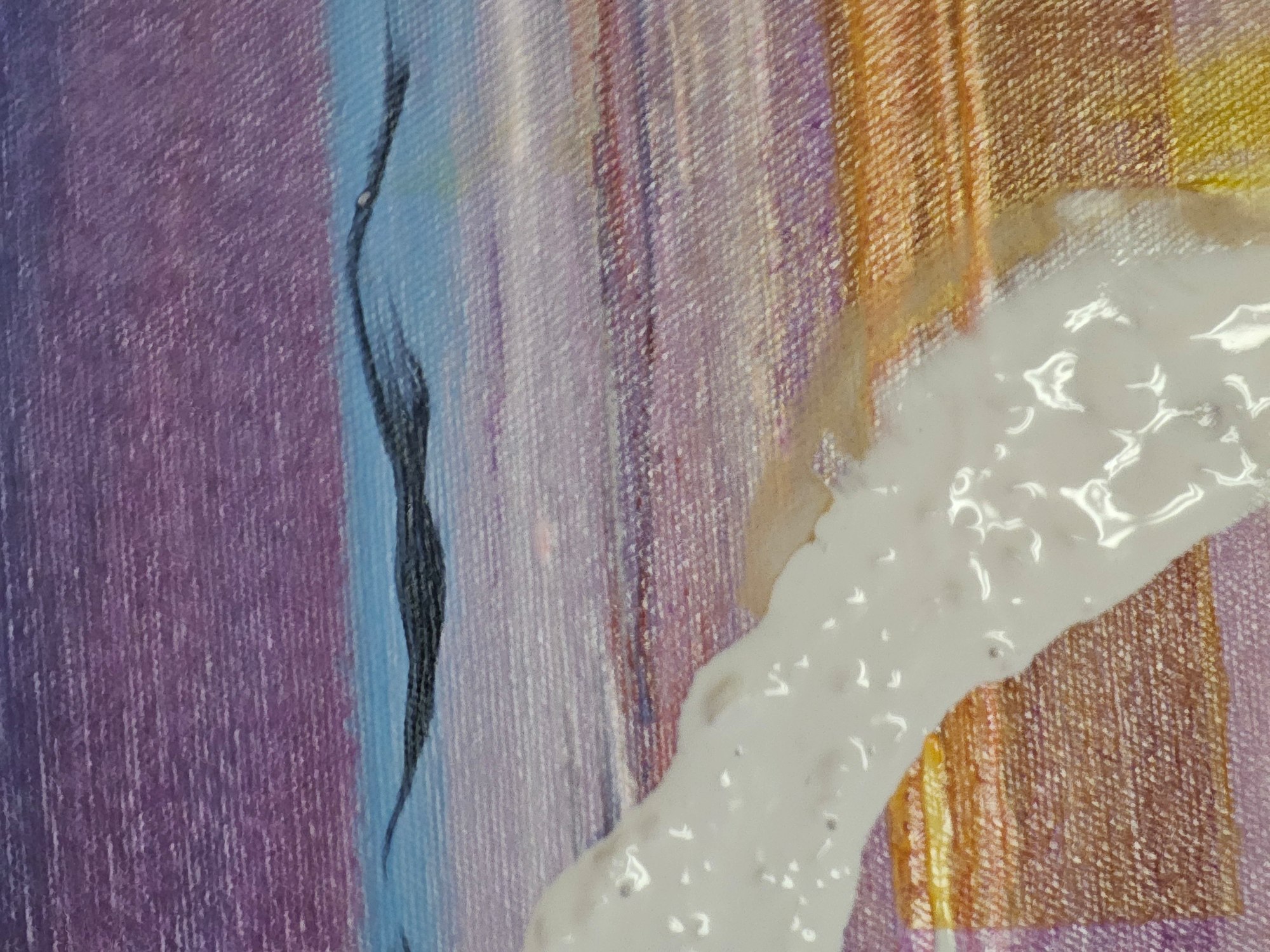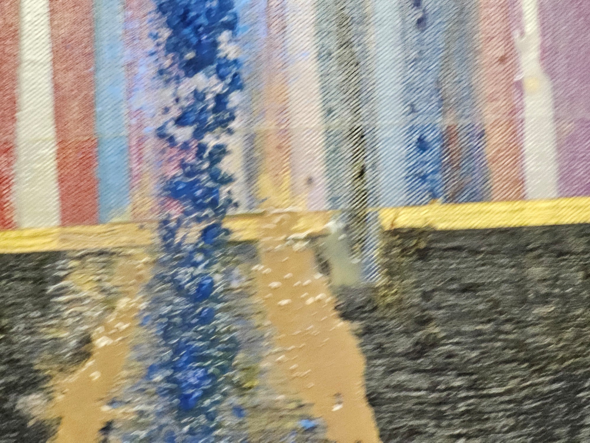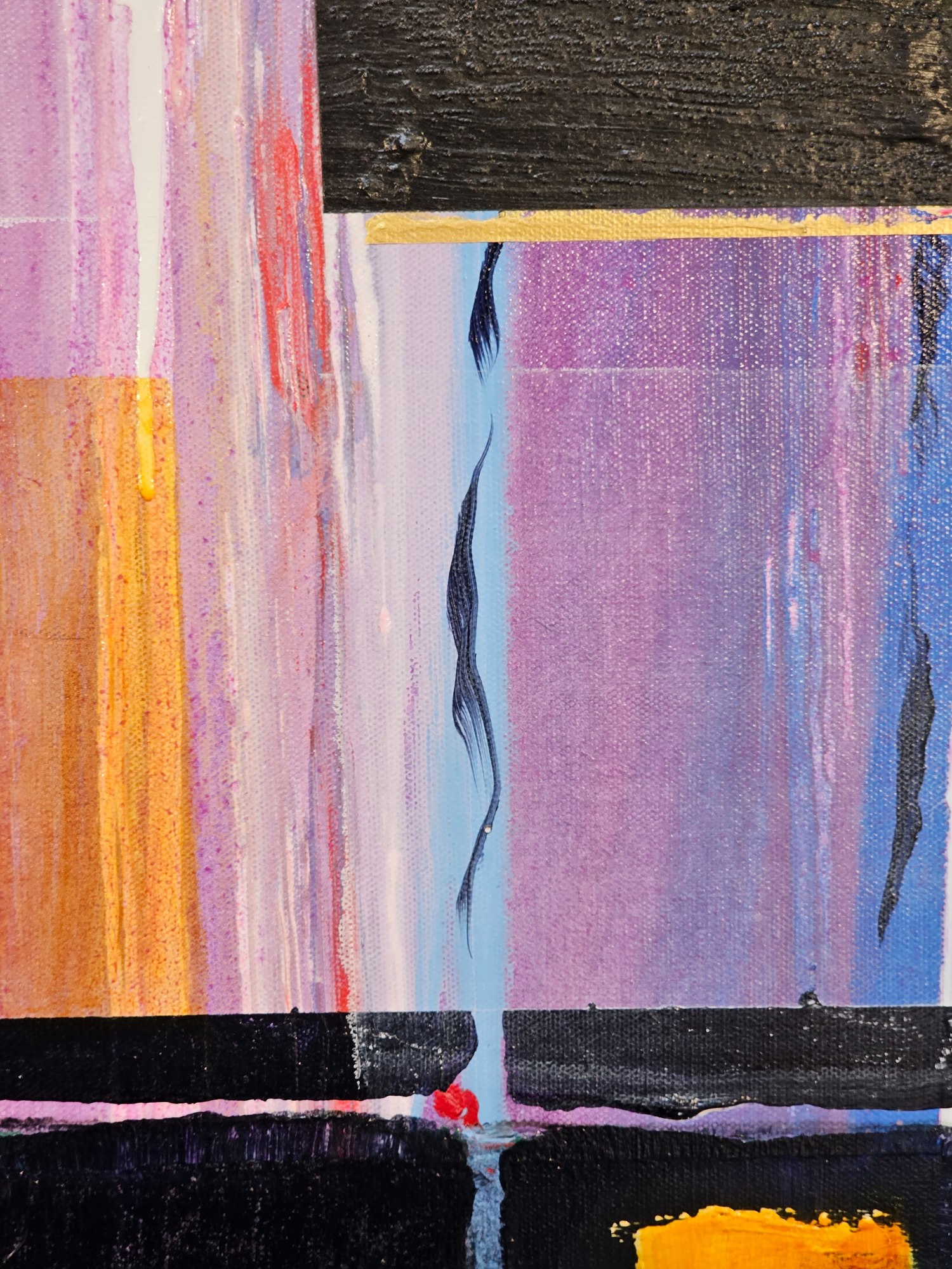 - Acrylic, Acrylic mediums, Crow Feather, 22k Gold Leaf, White & Black & Irridescent Blue powdered pigment, India Ink, Charcoal on 48" x 36" x 3" canvas