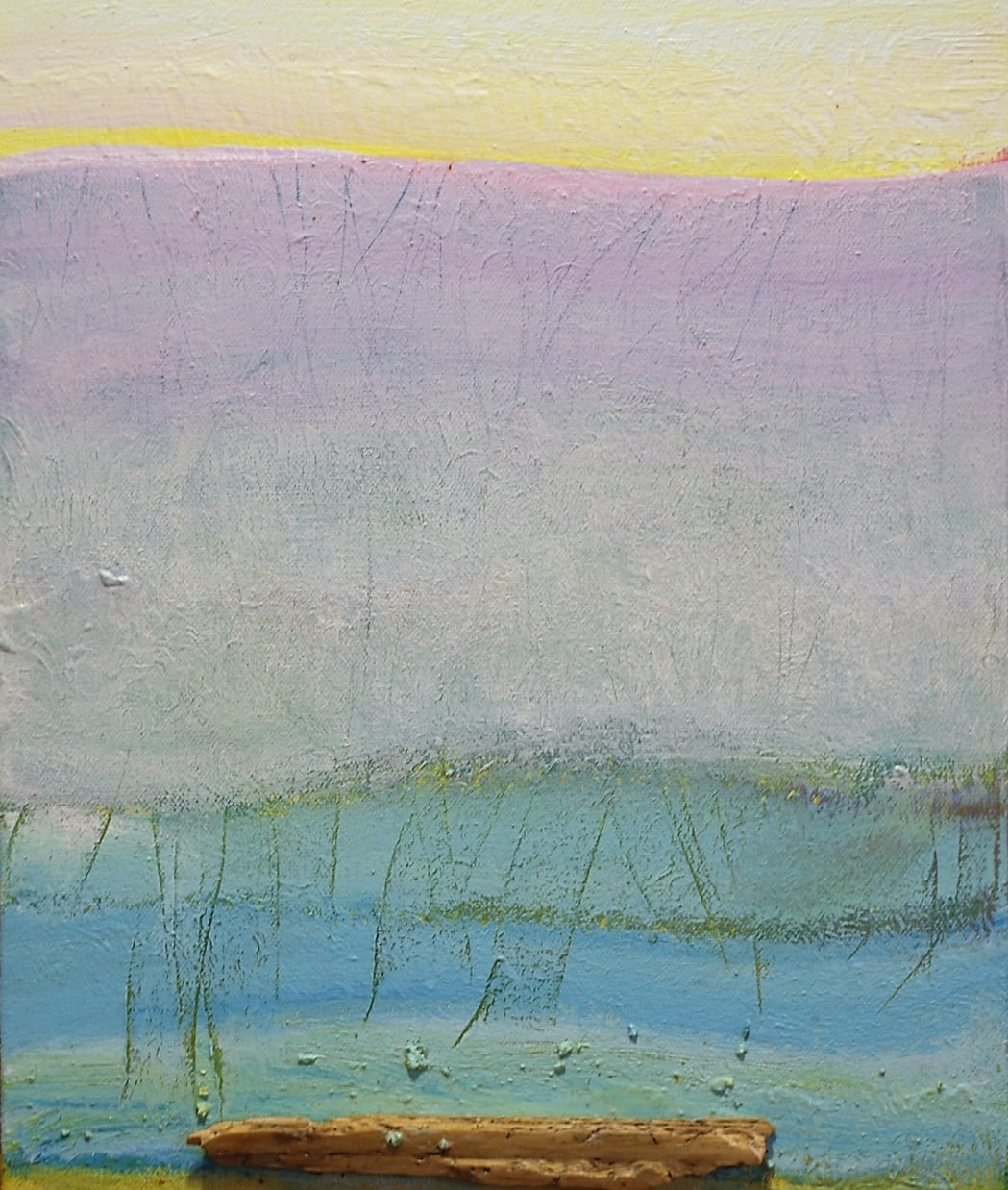 • Acrylic, found driftwood, found feather, beach sand on Canvas