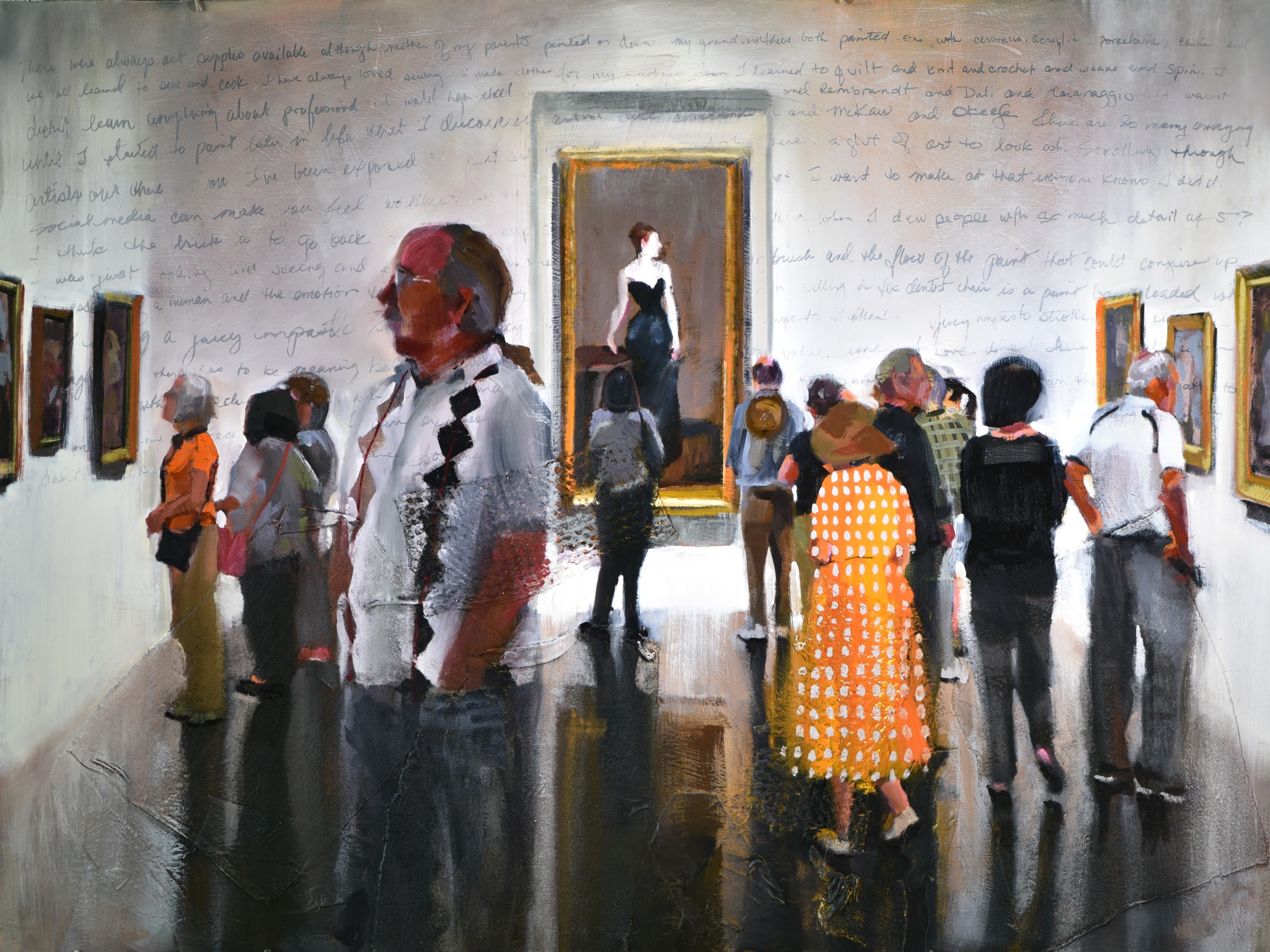 This piece is a little more outside the box. I used ink post-gesso to tell the story of how I was introduced to fine art. I was a seamstress long before I found oil painting and here I combine the love for both. The linen strips are attached with neutral pH adhesive as any linen would be to a surface but in the way they may be found on my sewing room floor. The writing on the wall covers my journey from a child finding my way in art to an adult with just as many questions. I chose a museum setting to discuss it as I'm sure that many of the greats such as John Singer Sargent have gone through as much soul searching.