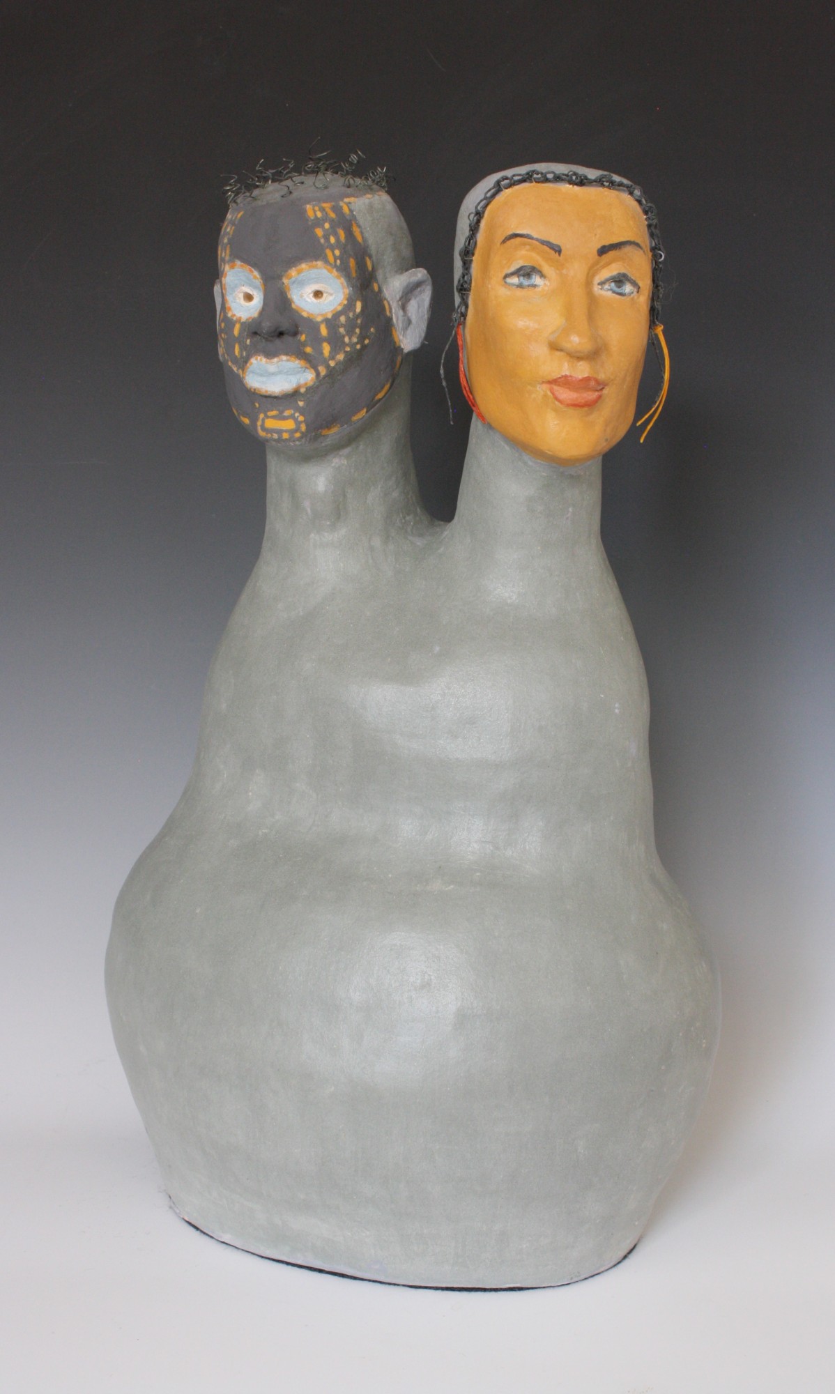 Ceramic sculpture with burnished colored clay slips and nichrome wire. Waxed linen thread woven and attached on to wire after firing. Number 6 in the series “In This Together"