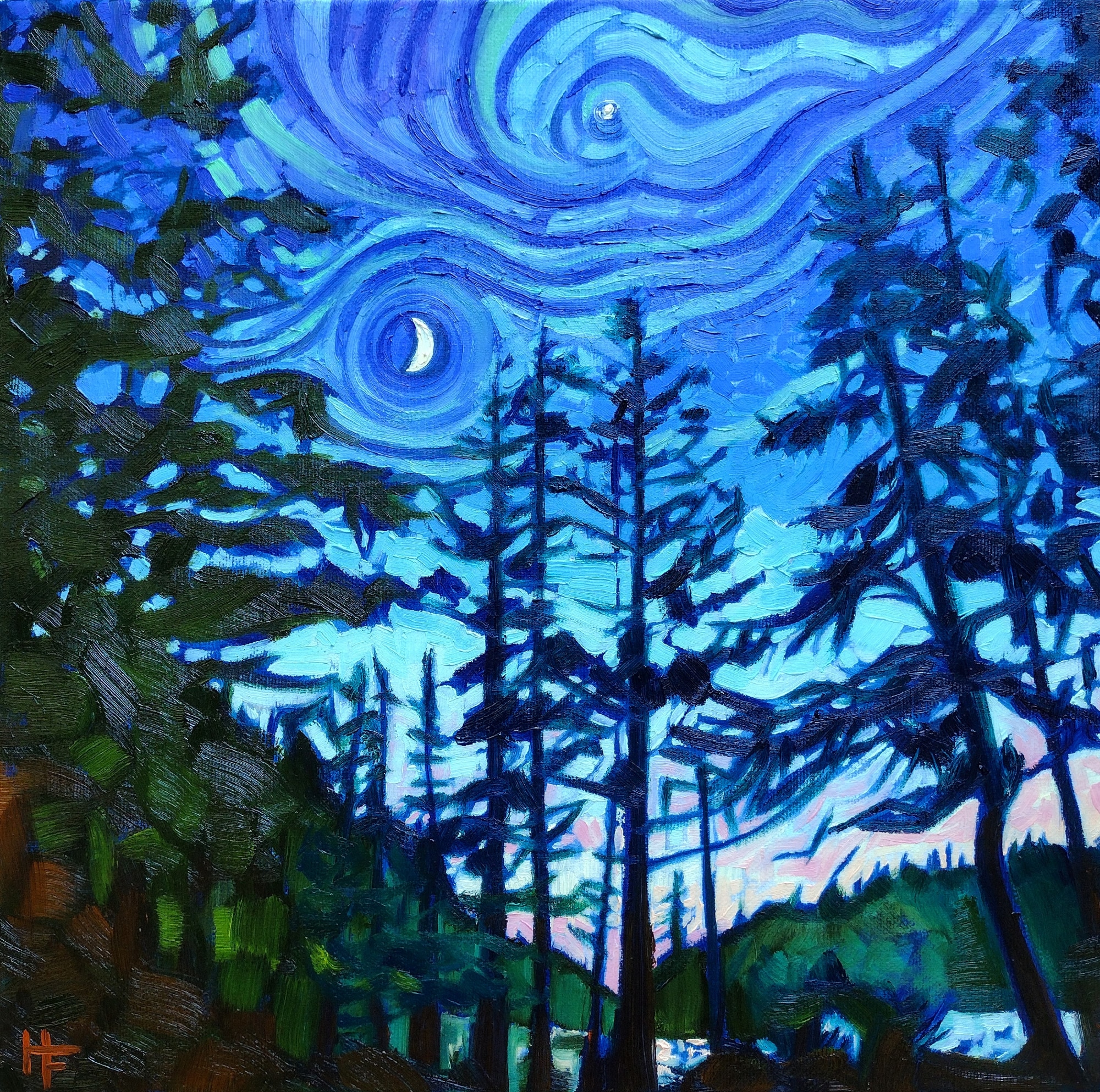 Created from a Boundary Waters Artventure, silhouetted cedars reach above distant pine topped hills. The hints of summer sun pink up the horizon. Venus follows moonglow rays dancing across the nighttime sky.