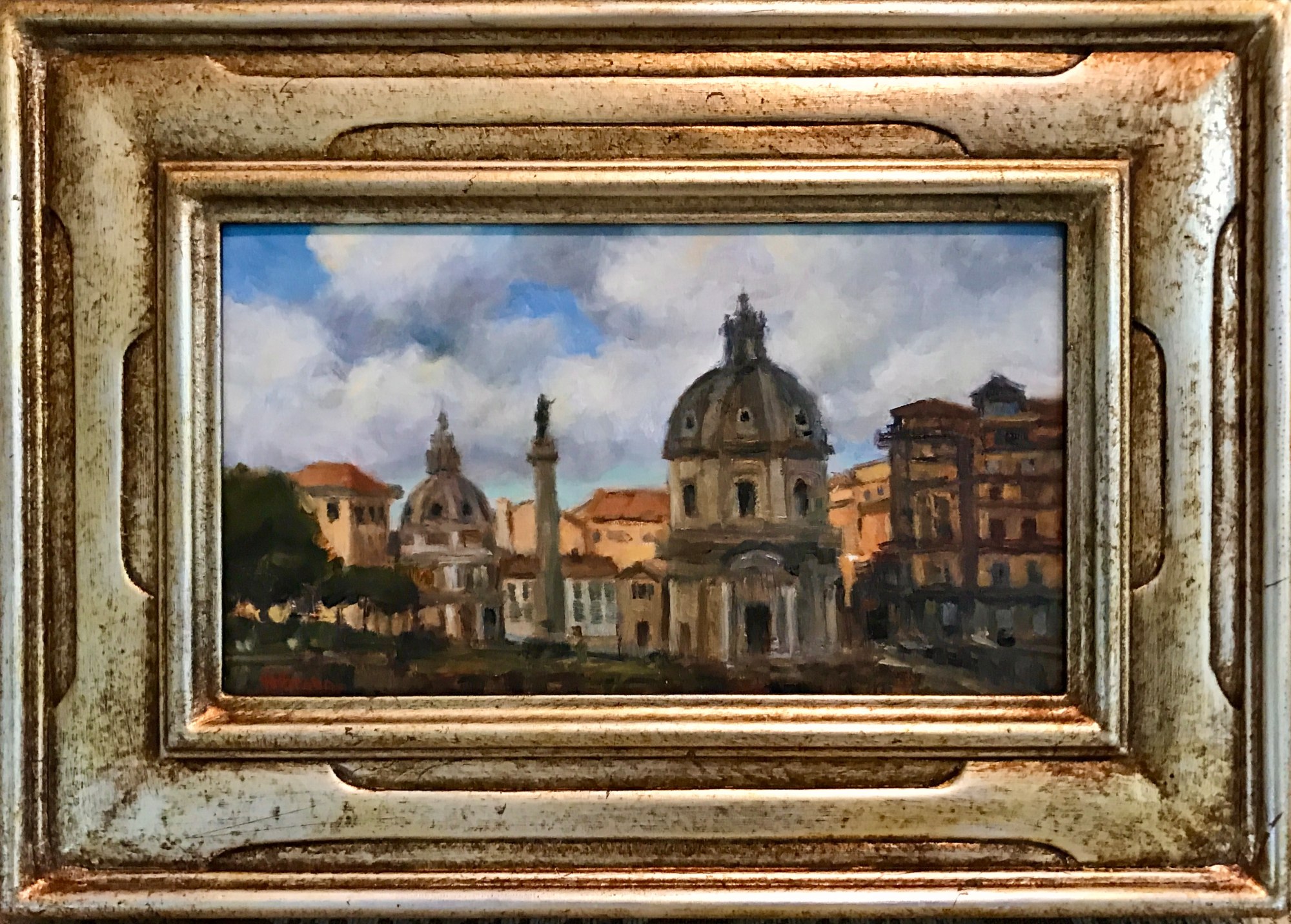 This painting is part of my Italian Skies series and captures the historic architecture surrounding the Trajan Forum in Rome, Italy. At the center stands Trajan’s Column, renowned for its intricate spiral reliefs that describe Rome’s military campaigns. The ashes of Emperor Trajan were once interred in its hollow base, and while the original statue of Trajan no longer remains, the column now rises 125 feet crowned by a bronze statue of Saint Peter.