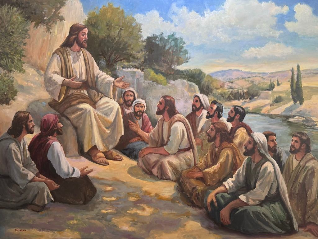 "Learning at the Feet of the Savior" captures a serene moment in the desert where Christ imparts wisdom to His twelve apostles. Christ is taking the opportunity to teach the apostles and answer their questions and help them to understand higher and holier ways and the doctrines of His Father.