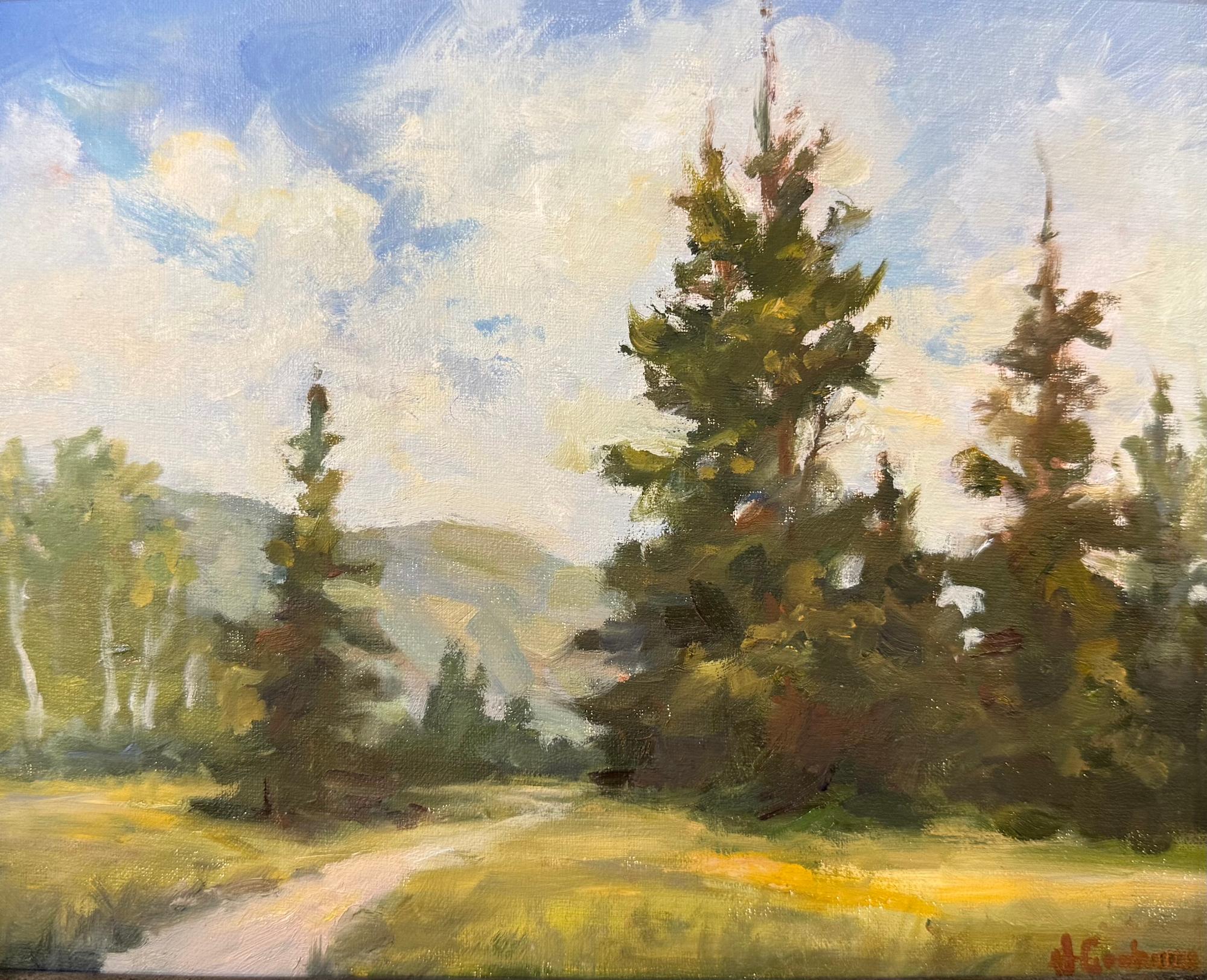 Painted entirely in plein air at Jones Ranch in Payson Canyon, this piece captures the tall evergreens reaching toward the open sky. Standing among them that morning, I felt their quiet strength and the grounding peace they bring, set against the wide expanse of the heavens above.