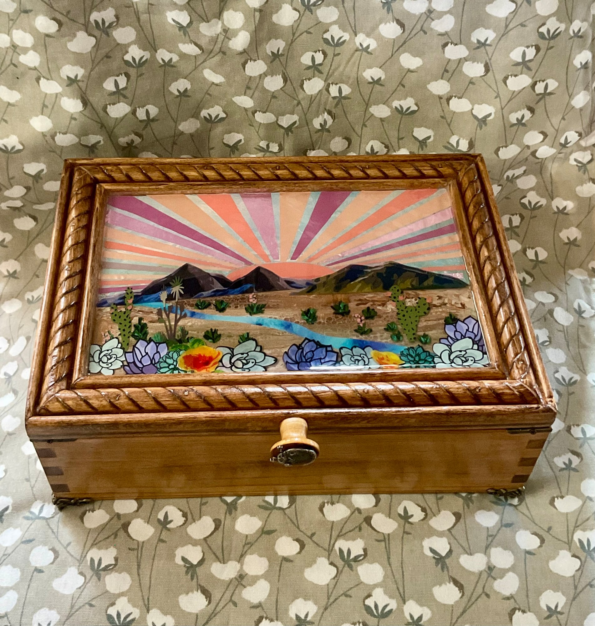 Handcrafted, unique one of a kind, heirloom quality art box. Made with quality red oaks and pines. Stained lightly with oil based aged oak stain. Inside of the box sealed with danish oil, to keep it natural. Desert inspired artwork on lid. Lid art made of layers of resin, mixed media and collage. Feet, corner hardware and hinges all an antique brass finish. Knob designed and custom created by the artist, repurposing a necklace pendant in the process. Boxed joints add durability and beauty. Branded artist copyright design on bottom.