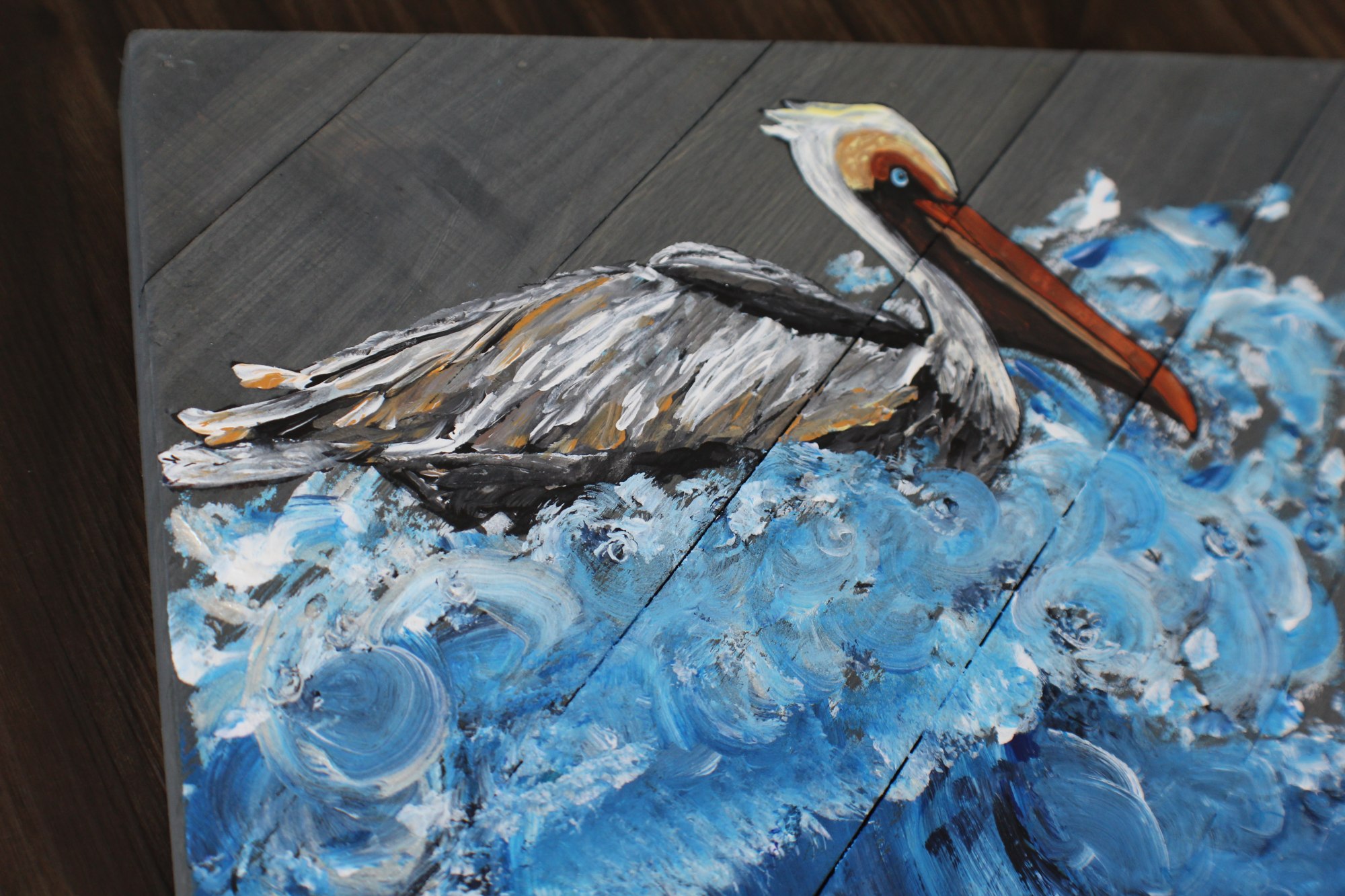 Painted on wood planks to look like dock boards. Mix media. A Pelican hitches a ride on a wave to take a break from catching his dinner.