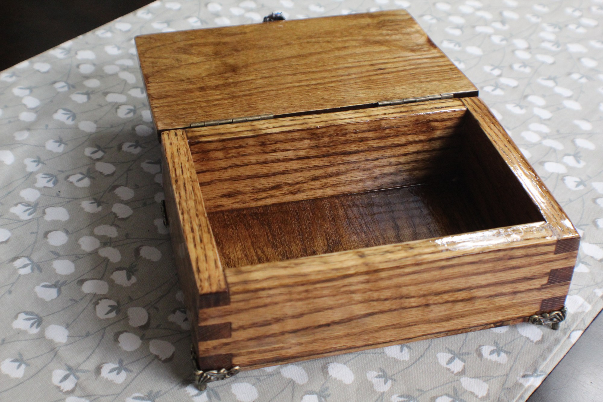 Solid red oak, boxed joints, heirloom quality handcrafted one of a kind art box. Sealed inside and out in an oil based varnish. Art on lid is mixed media collage layers and art resin layers. Original piece, handcrafted and designed. Artists brand burned in the bottom. Brass hinges and feet and a handcrafted ladybug knob.