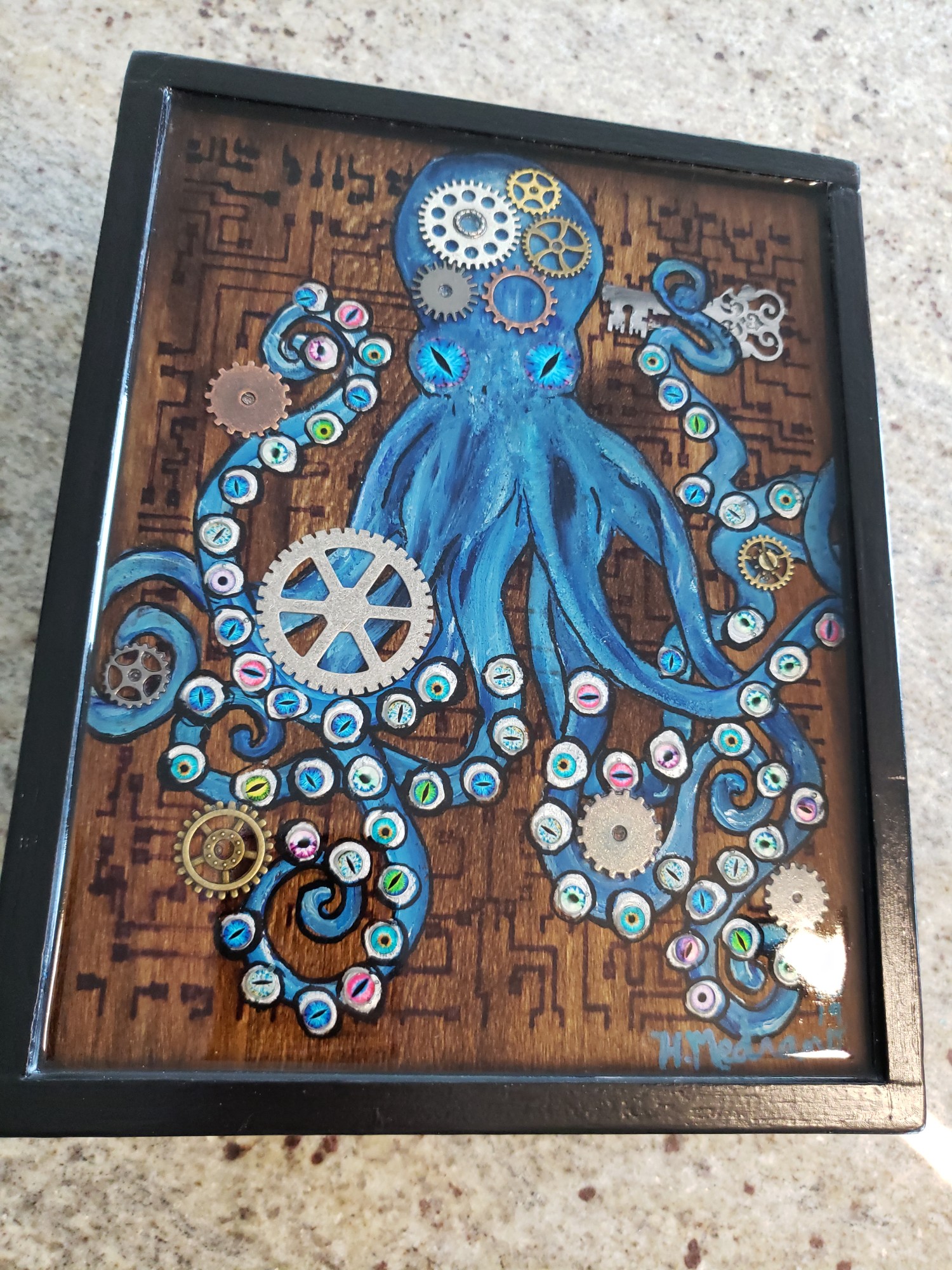Solid wood, handmade trinket box, lined with gray felt. multi medium sealed in thick resin. Plus shipping costs. Measurements approximate.