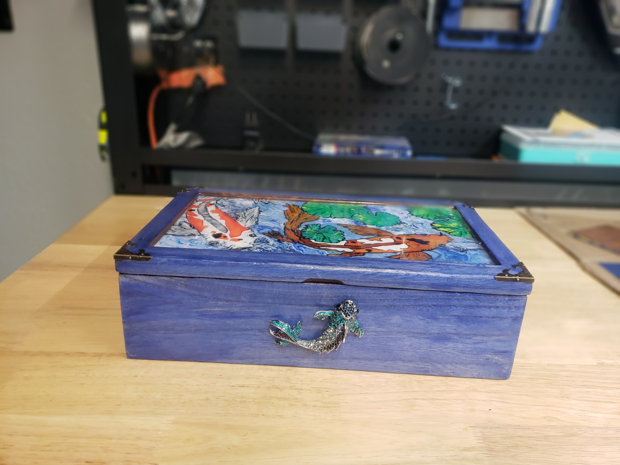 Koi design Drawn, painted, original, one of a kind tea box. Made with mostly walnut. Bottom is pine. Hand painted and then sealed with food safe resin.