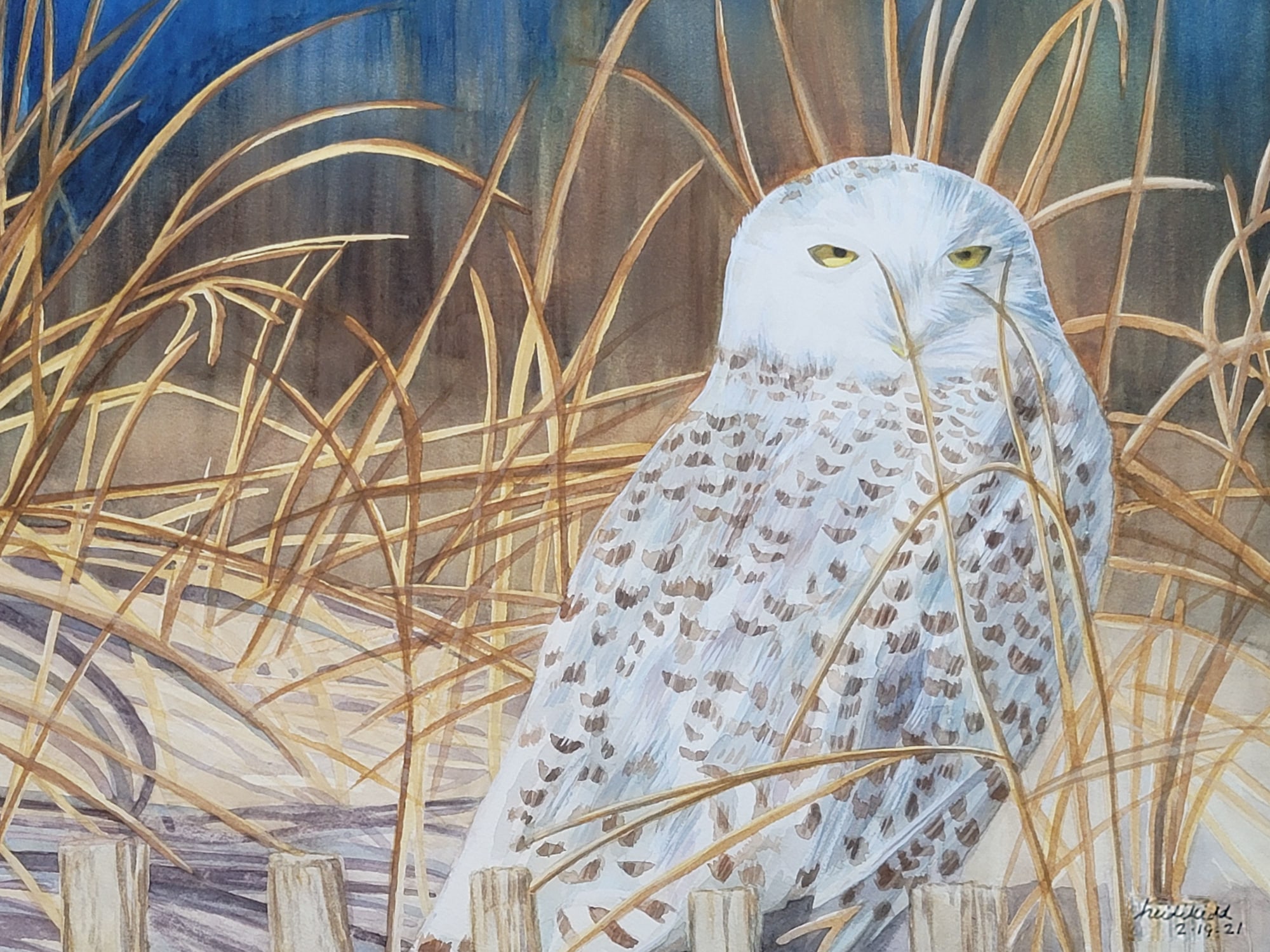 Snowy Owl watercolor on paper. Female Snowy Owl on L.I. They venture from the sandy beaches of L.I. from far north of the Arctic Circle. They have many names including the Polar owl, Artic owl, Scandinavian night bird, great white owl, and terror of the north. They are listed as vulnerable by (IUCN) International Union for Conservation of Nature. They keep warm with their abundance of feathers which makes them the heaviest owls in North America.